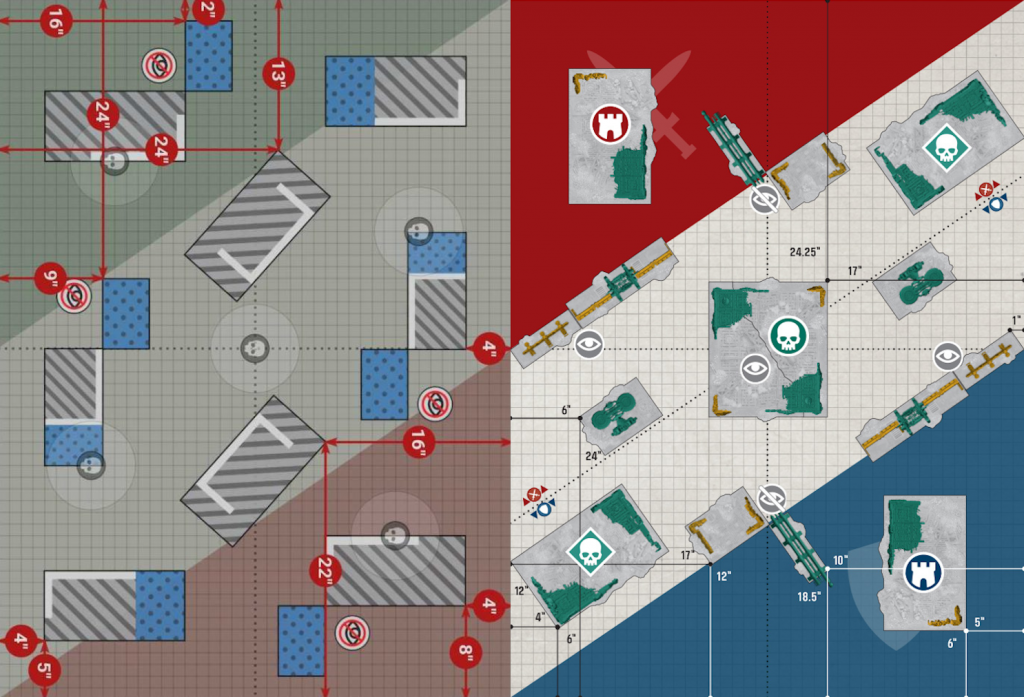 Credit: Games WorkshopIn terms of raw math, there will be less terrain on the battlefield, but that comes with a few caveats; going off of the provided Terrain Areas, we're looking at a shift from 628in^2 to ~608in^2, but that doesn't tell the whole story. Looking at a couple layouts with diagonal deployment, GW Layout 2 & the newly-revealed Crucible of Battle, the latter doesn't feel less busy in terms of its terrain, and in fact has a reduction in firing lanes, given those thinner 'line' Terrain Areas are also Obscuring. This is due in part to the fact that, between the two new 11th layouts we've seen, the backfields have a lot more room. This should make for less clustered deployments, and that means potentially fewer opportunities for jailing lists to operate effectively. Later on in the game, this could also mean Deep Strikes are harder to screen, as parking a squad in the central line of deployment exposes you to a nasty cross-map firing lane...so be sure to give them Hidden, if you can. Another reason this seems similarly thick with terrain comes down to the footprints having crenelations, and little jut-outs that attempt to reduce the concerns with all of 10th's L-shaped terrain. I think that hate was overblown, mind you, but the push for a thematic map means strict squares no longer do. Another change is down to the color of each Terrain Feature—Yellow means go, paradoxically, for Vehicles & Monsters to move over, while Teal is similar to 10th's Ruins, passable only by smaller units. The last thing I want to call out is some of the wacky measurement. 24.25"? 18.5"? The best reason I can surmise for why these hard-to-remember numbers were chosen comes down to the fact that the central ruin mimics A4 paper size, with room for bleed, at exactly 8.5"x11". From a printing perspective, it probably made some sense, but leaves us in an odd spot that likely needs some touching-up from a Tournament Companion somewhere down the line.