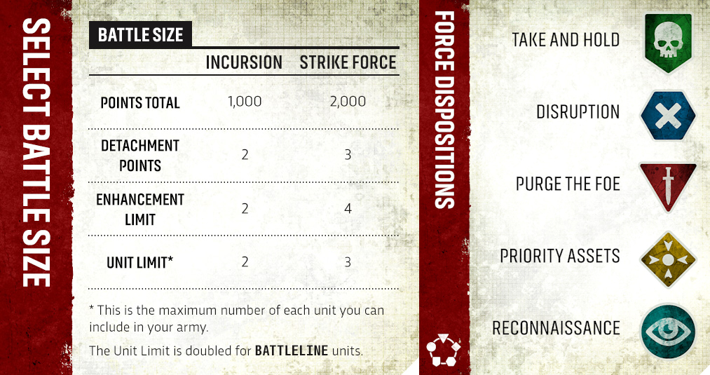 Unit customization has been a center point of narrative play for the whole of 10th, and that's being brought to matched play in 11th, with some changes to Enhancements. Going forward, Detachments will come with Enhancements for units, and not just Leaders; this isn't retroactive, as far as we're aware, but instead spreads the design ethos of 10th's Corsair Enhancements across all armies going forward. This makes sense, especially with the above mention of breaking down skew options by Detachment Points, and some niches lacking dedicated Leaders. I also feel this is a compromise on pointed wargear, because while we've heard nothing of it coming back (leading us to believe it isn't), these unit-specific Enhancements provide more options for granularity in list building. As a bonus, the number of Enhancements available to an army at 2000pts is being raised from 3 to 4, given many lists will pick from two Detachments' worth. I'm a huge fan of how the recent swathe of Corsair rules were handled, so seeing that version of Enhancements become the rule and not the exception seems great!4. Force Dispositions Increase Asymmetry