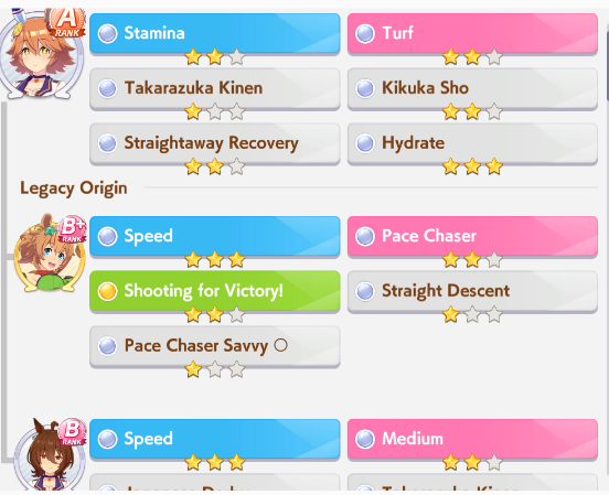 You can check your Uma Sparks at any time with the filter options. You may even find some surprising things; for example, the 1 Star Medium Daiwa may seem odd being that high, but that's because the game is including her parents into the equation. Always check the full inspirations!Of course, if you want to try doing things on your own, or simply lack access to a consistent source of friend Umas to borrow, there is a way to (slowly) farm up your own higher quality sparks. I do want to preface this by saying that this method is very labor intensive and honestly labor inefficient, but it can be done. Essentially, you’ll simply need to continually rotate your roster of racers over and over again, slowly increasing their levels bit by bit, and then working on making sparks possible from this process.