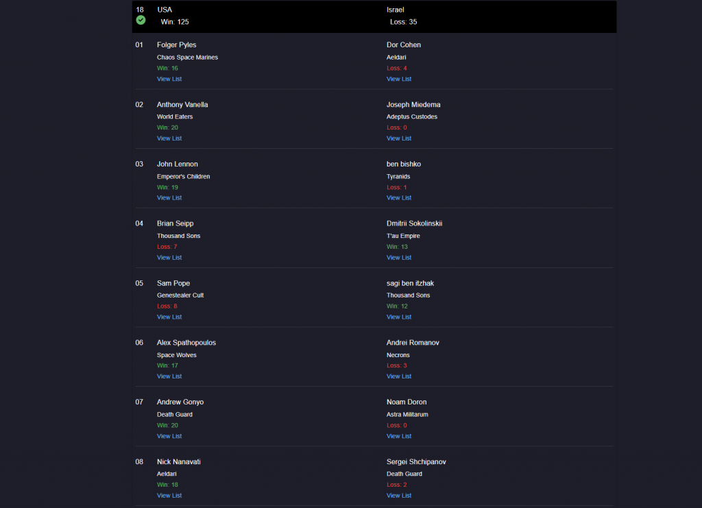 The round largely went as predicted on both sides. Unfortunately for Team USA, some of the more draw-ish games caught the low end of the draw. Some of the wins trended toward smaller wins. Brian's Magnus went up in flames and his victory margin shrunk. Three games predicted to be around 10 points end as 10-10 (instead of 11-9 or 12-8). The big difference makers ended up being Folger's Chaos Cults into Skark's Imperial Knights, where Folger only scored 10 as Skark showed off his experience with the matchup and just how good Crusaders could be. John on the other hand, kicked off his redemption arc by high rolling his opponent Leisu all the way to a 17-3 finish. As the games wound down, Team USA ended with a draw into Poland.