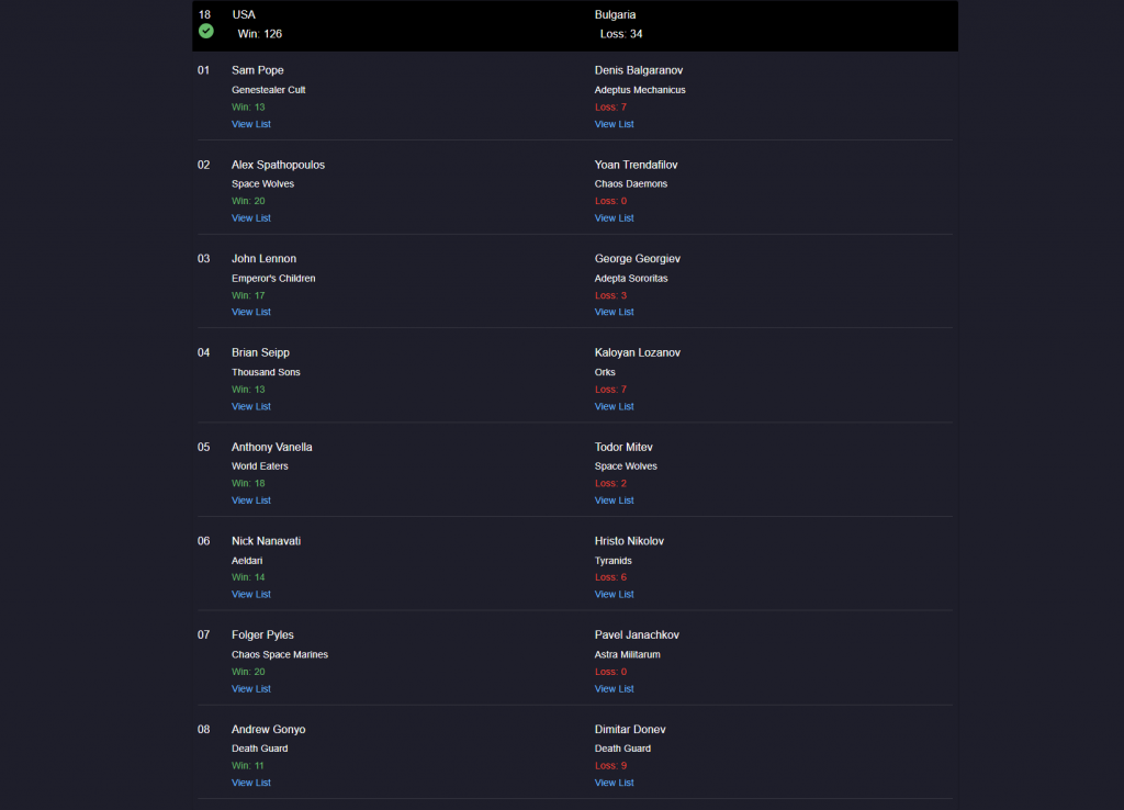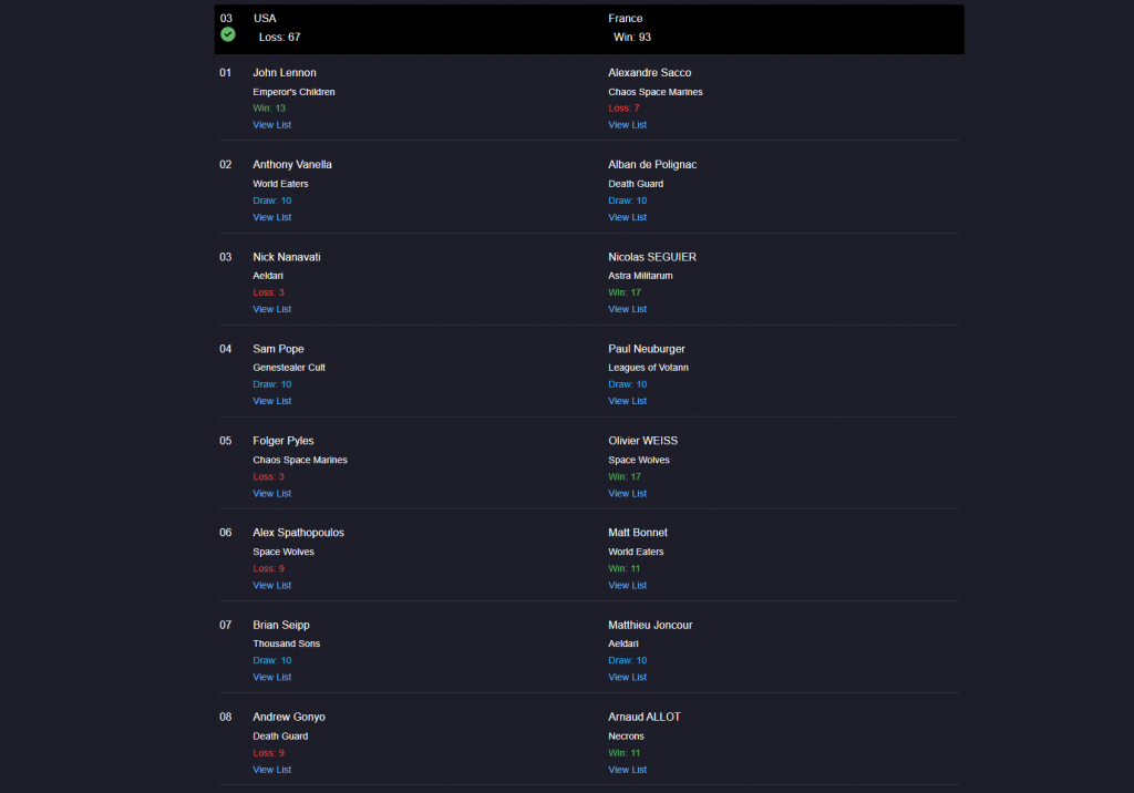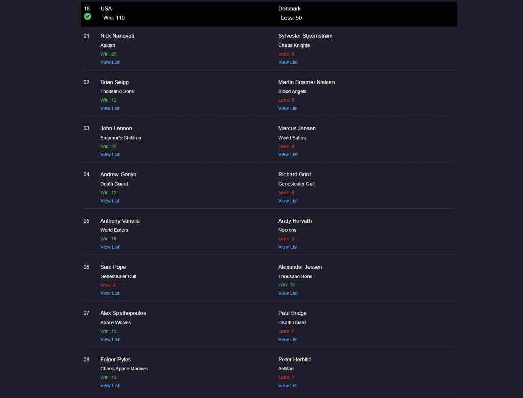 The rest of the round seemed to be going OK, with the team cruising and the team generally trying to avoid making decisions too hastily after learning our lesson in the prior round against Team France. John made up for some of that lost differential, grabbing a 17 into Death Guard, while our other wins and draws delivered.