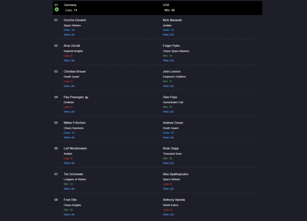 Okay, so we took an L. We only had a small lunch period to prepare and who is our next opponent... Oh crap, it's Germany. As the highest-ranked 3-1 team, we'd end up getting paired up into the 3-0-1 team. It was time for the team to ball up its feelings and get ready to face the Germans.It turned out we'd have a truly difficult 1st defending Chaos Knights player. As a few of our knight counters only truly worked if you weren't on some specific tables and so having defender meant the Chaos Knights player could just pick a table where the counters wouldn't be effective. We paired Anthony's World Eaters into him. Some of our other hard counters could land, such us Chaos Cults into Imperial Knights and GSC into Drukhari, and we finished pairings feeling pretty optimistic.