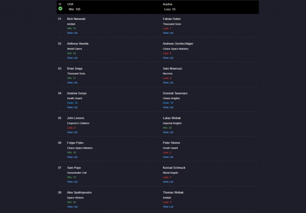 We were fresh and ready for the final day of the WTC. It was time to close out the event and our first opponent of the day was team Austria, representing the event's host country.To be fairly honest, our matrix into Austria's was not good. Before the round team captain John Lennon told the team that we had some rough pairings here, but let's just be better. John would end up catching his red matchup into Imperial Knights and catching early strays as Lukas Wobak pressed hard, and John was forced to drop his prediction to a 0. Anthony, hearing how that table was going, asked coaches for permission to put his foot on the gas, or as he put it "can I kill this man?" and proceeded to balance out John's 0 with a 20 of his own. Alex Spatho pushed previous Warmaster Thomas Wobak to the edge and scored a 20-0 as well. The team would end up flipping some losses into big wins, such as Folger scoring an 18 against Death Guard, giving us a comfortable win after adjustments were made. Even with John catching his first 0 in WTC history, Team USA won, 105-55.