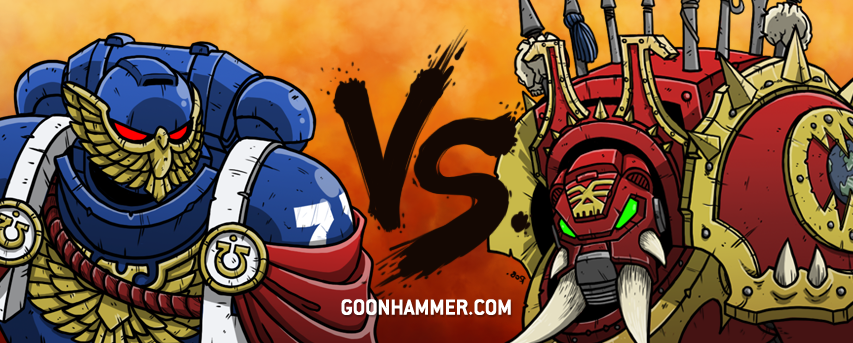 World Eaters vs. Hulltramarines for this week's final showdown, a classic red vs. blue setup. The red team here is another Goretrack list, built around two scary Transports, one Raider with a big Exalted unit and one Berzerker Rhino. Hellbrutes provide cheap support and a way to overwhelm the foe; incorrectly handled, they can go through a line like a wrecking ball, and if the big melee units hit at the same time, it might be too much. They also nsure a nice, uniform defensive setup till the melee stuff commits, which can overwhelm enemy firepower.