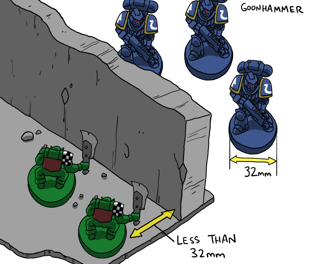 Alright, so the trick is to make it so your opponent can't fight you through the wall by being more than 1" back. But that only works if the unit charging you can't just move through the wall to wind up within 1" of your unit. Because ruins have the Breachable keyword, this means that INFANTRY, BEASTS, and SWARMS can just walk right through that wall and punch your poor, defenseless(?) unit in the face.The solution then is to not leave them any space to do so. And the way you do that is by making sure that the distance between your models' bases and the other side of the wall is just over 1", such that a 25mm or larger base cannot fit between the wall and your units. This will prevent a unit from being in Engagement Range while touching the other side of the wall, but unable to physically fit between your models and the wall. The thicker the wall is, the easier this is, and the larger the enemy's base. So this is super easy if your opponent is trying to bring in Terminators on 40mm bases, and much more difficult if your opponent has itty bitty Harlequins on 25mm bases, where if the wall is thin enough you might not be able to screen them out!