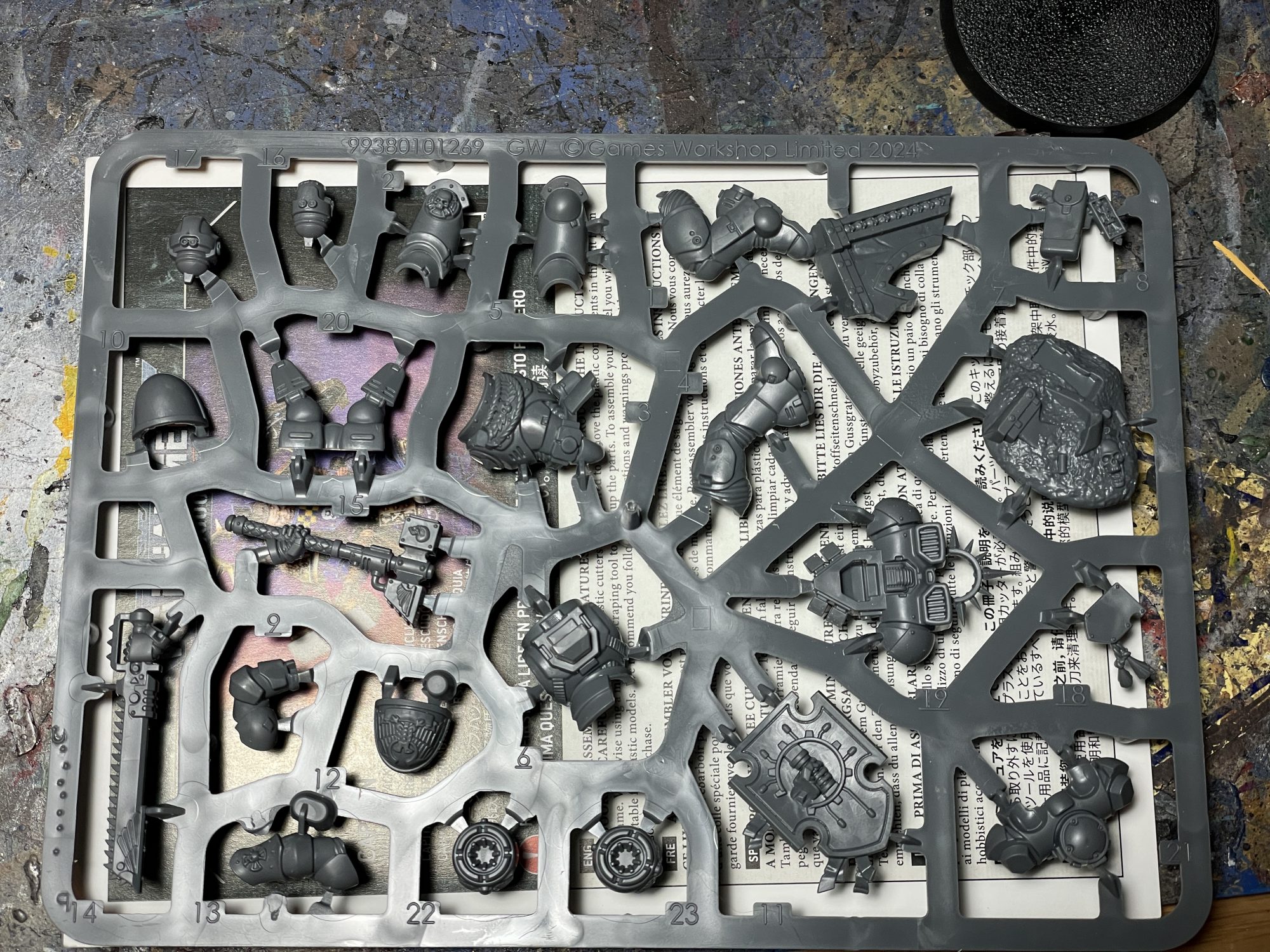 Space Marine Jump Pack Captain with Relic Shield Sprue.SRM: I found building this guy to be simple, more or less the standard in construction for a Space Marine character model. His hero rock is nice and sturdy, with his foot moulded onto it and a wide connection point onto the extra basing details. If you wanted to cut him off that rock for whatever reason though, it wouldn't be a challenge. His body is a little finnicky as you're kind of building its hollow shell, so a little dry fitting to make sure everything fits snugly is my recommendation. His arms have subtle guide posts to get them in place, but if you wanted to swap arms or repose them, it wouldn't be much work to shave them down. Said arms are my chief complaint with the model though - while they're posed well, the shoulders have these wide pegs that fit into similarly sized sockets on the included pauldrons, meaning your standard Marine pauldrons won't fit without some converting or gap filling. You also have to stick that tilting plate on, as that area is very clearly meant to be covered up. I don't mind that as it's a great place to stick some heraldry, but I understand folks might like options.