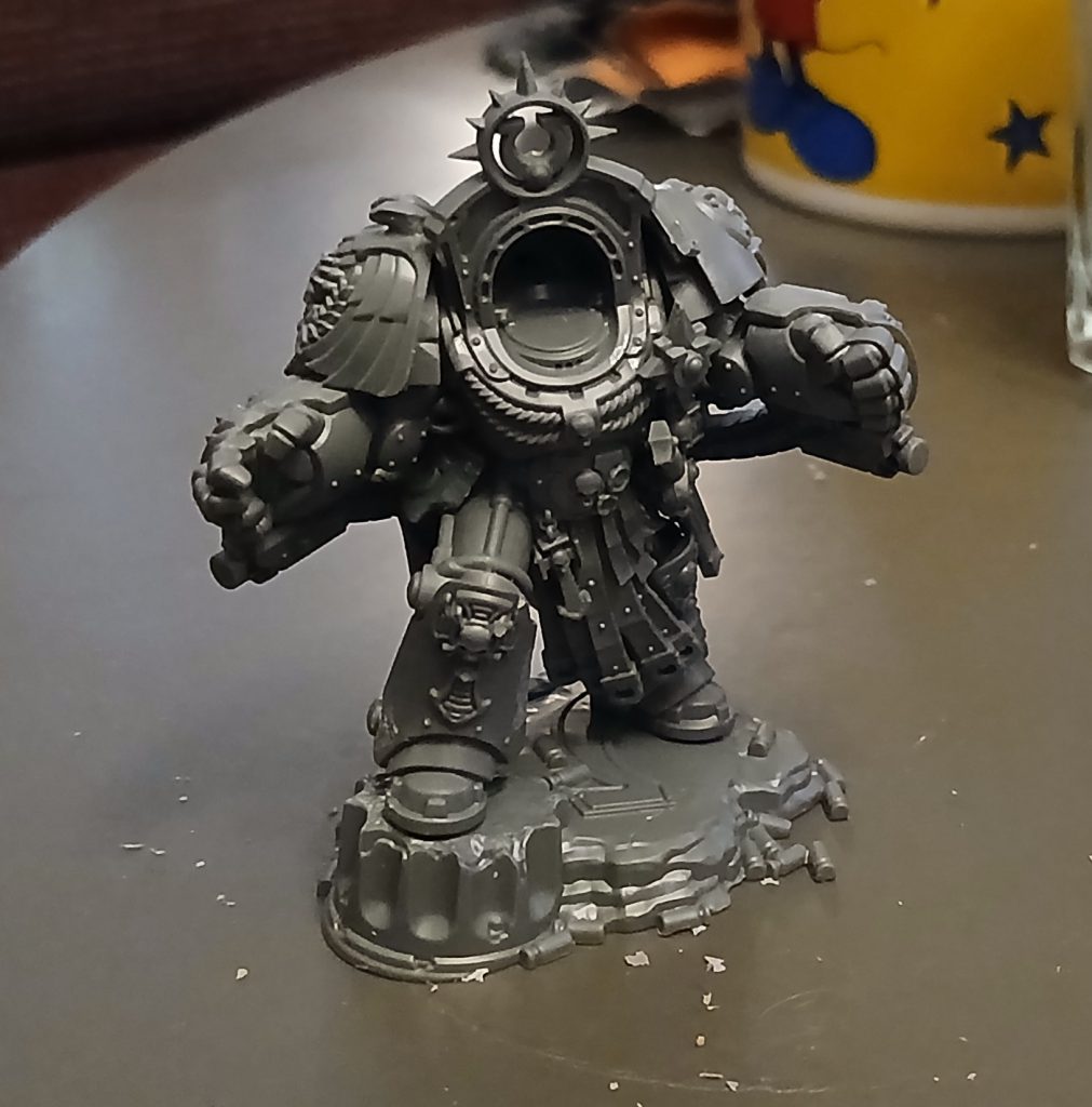 How does he build? Pretty straightforwardly honestly, there wasn't ever really a point where I thought to myself "this is unnecessarily difficult" - though there are some absolutely essential sub-assemblies to be made here, firstly you are absolutely going to have to paint the head separately and then put it in later, sitting as it does quite deep inside an exaggerated version of the high vaulted space typical of Terminator armour. Glue it to a toothpick, paint it, and then you can stick it in later (there's even a big peg on the back of his head to match to a hole inside the armour to help line it up properly). The second necessary sub-assembly is the cape - the area underneath would be all-but inaccessible if you tried to paint it in-situ, given the large pillar-debris section he's perched on top of. Fortunately the cape is a single piece and it's very easy to pop on and off to check how everything is lining up, I stuck it to my painting handle with a big wodge of blu-tac which made everything a breeze.