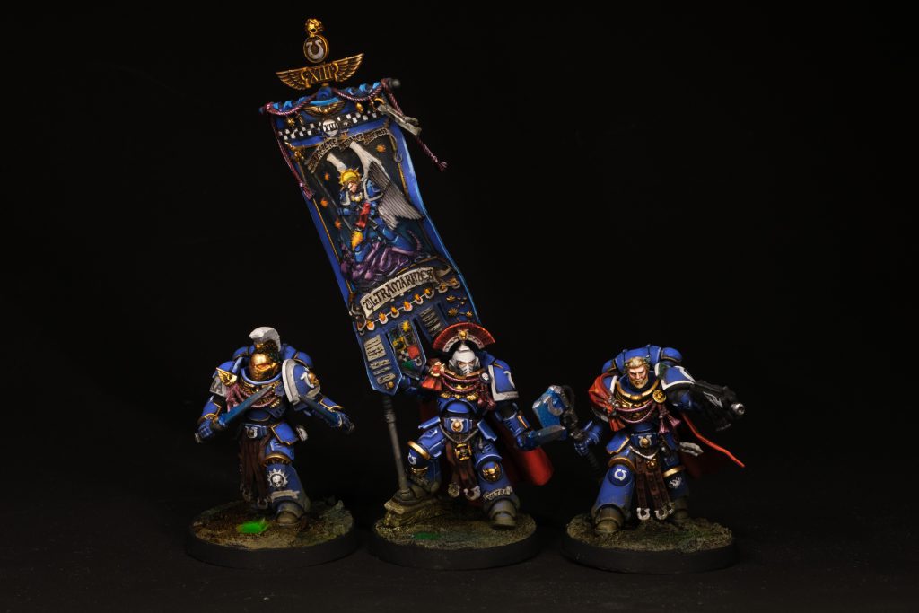 Bearer of the Bed-Sheet of Macragge - Credit: Keewa Note - This helmet is from the Ultramarines Upgrade boxThe other Victrix guys, on the other hand, go together very nicely and paint up quite easily, there aren't a ton of options to be had, one guy can be a champion with two gladiuses and no cape, the others have a long cape and either an axe or gladius and bolter, I will say that I miss the fun tower shields from the old Victrix guys (I'd definitely have taken sword and board if given the choice), these lads have all the trim and bling you'd expect from Calgar's elite, silly eagle wing-moustache helmets and all.