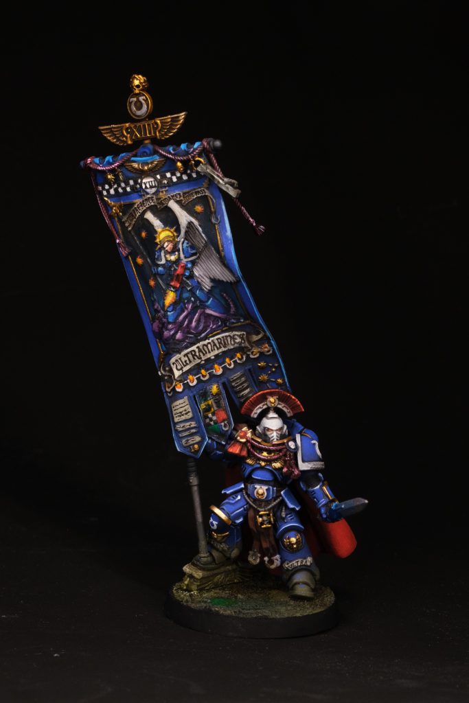 Victrix Guard - Credit: Keewakeewa: First up, let's talk about the bedsheet in the room - that enormous banner - it truly is colossal, dwarfing even the Primaris Space Marine holding the damn thing. Whenever I posted my progress photos to the group, they'd always say "I can't get over how big that banner is. Unfortunately I'm a certified bas-relief sculpted banner hater, I find them incredibly difficult to paint convincingly without them devolving into a total mess (to me, a plain banner with transfers always looks much better) and this particular banner is far beyond anything else. I reckon about 95% of people who buy a box of Victrix Guard will choose to build the banner guy, and 100% of them will regret it.
