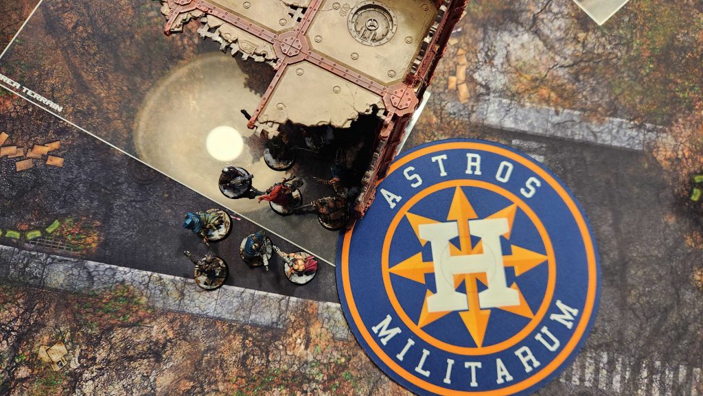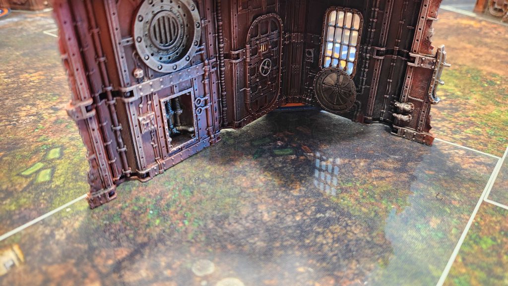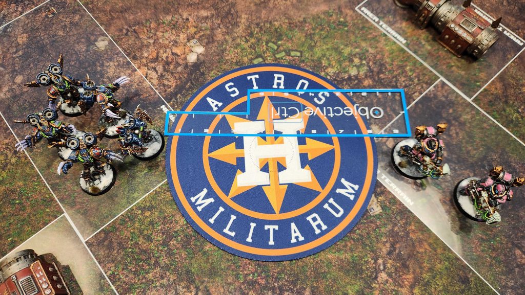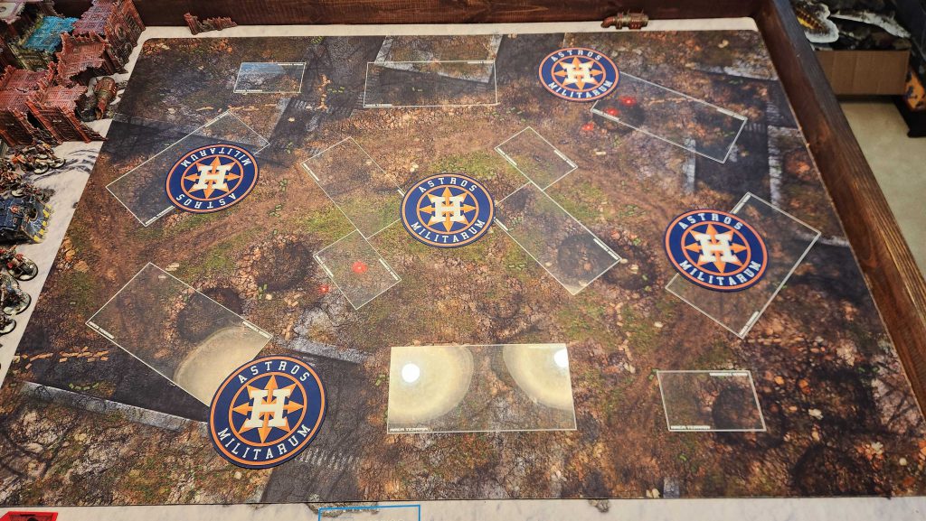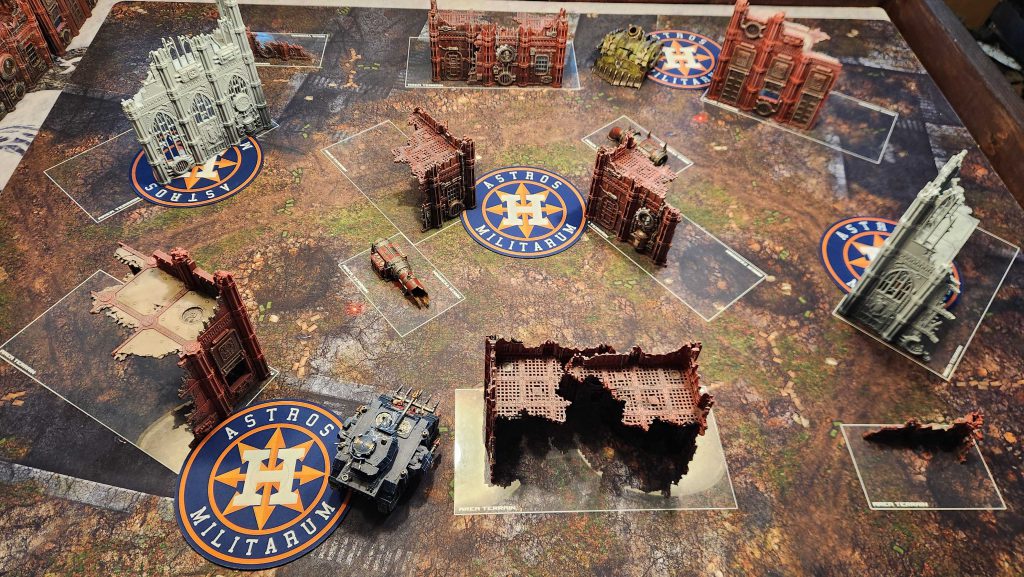 I generally would only recommend playing this layout on Search and Destroy deployment. There the central D ruins work well with the corner deployment to create easy staging up through the middle of the table and the placement of the home objective is relatively safe while still being contestable from the other side of the ruin.