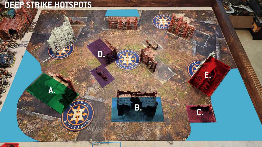 Being as open as it is, this map doesn't offer nearly as many great deep strike spots as most other maps. The corners are really going to be the most common spots here, and even then those long sightlines down the sides of the table make those somewhat impractical. As a result, your deep strikes will typically be a bit more dynamic on this layout, and dropping down in front of the enemy instead of behind will be a bit more common unless they've over-extended.