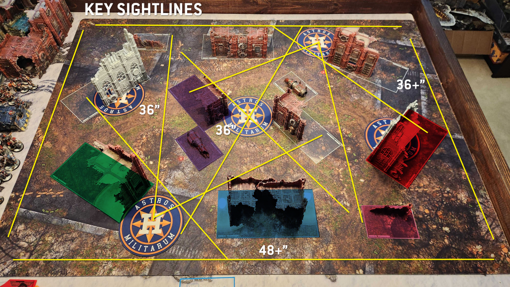 Across the middle of the table you have a relatively easy line you can draw through the three objectives on Sweeping Engagement. This won't be an option on Search and Destroy, but the diagonal sightline will still be available, and generally you can get shots across the middle from either direction as needed - it'll just be a question of which objectives you're drawing a line between.