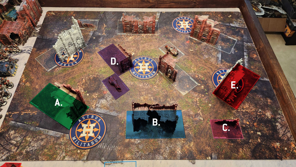 E. The other large slanted ruin. This one will never be in your deployment zone. It combines with C to create another set of solid cover on Sweeping Engagement. It's also going to be a key piece of cover for masking deep strikes and Infiltrators.