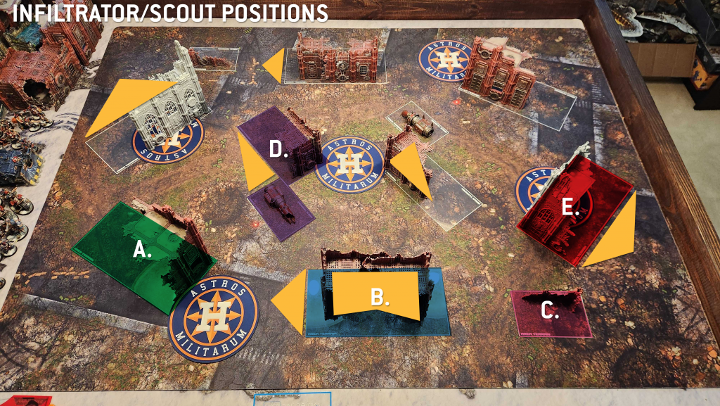 Those center D ruins also serve as strong spots for your Infiltrators and Scouts, letting them set up for solid positions, and setting up on the center objective with infiltrating scouts who can them move forward or backward depending on whether you have first turn is a solid play. The side E ruins also serve as good protection for infiltrators, and they can usually hold the objective in that ruin somewhat safely - it's harder to do on Sweeping Engagement.