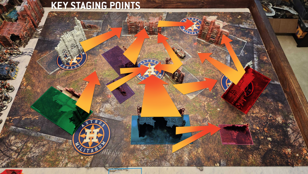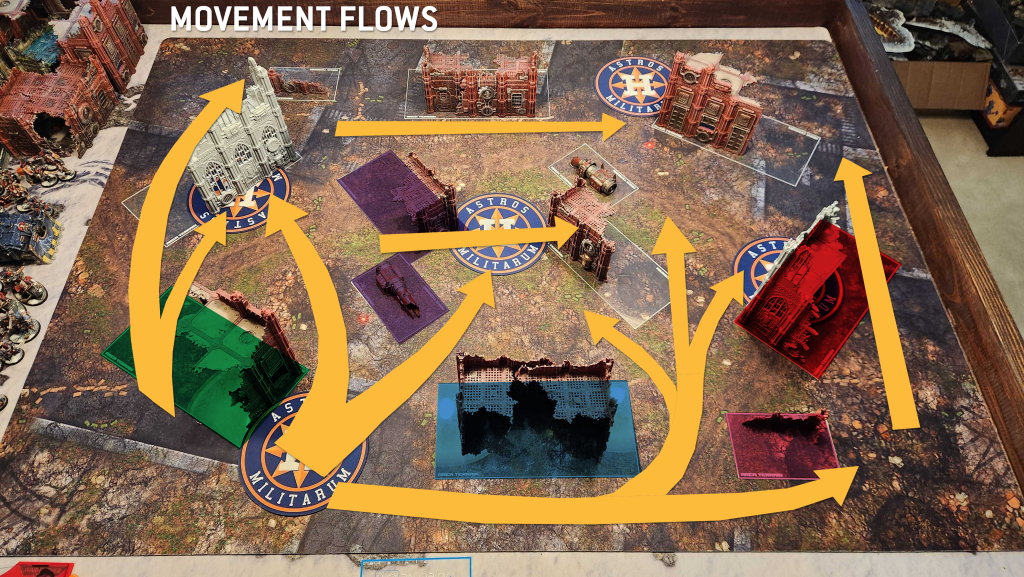 Going around the sides of the table is a common play on Sweeping Advance but those can be long trips with little payoff. Going up the middle is going to save time but be much more dangerous. For melee armies and infantry, pushing across the middle of the table through the two D ruins is going to be the most common move.