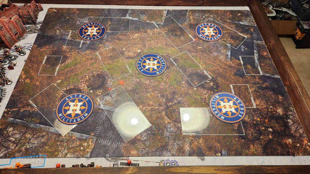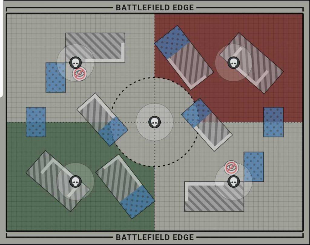 The big challenge here is that middle objective. Not only is it in the open, but if you've set up the correct ruins, you won't even be able to hide within 6" of the middle of the table, making Area Denial and Establish Locus particularly dangerous on this map. It's also easily visible from both of the other no man's land objectives so if you're standing on that objective, don't expect that to last long.