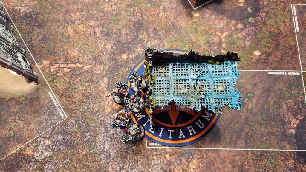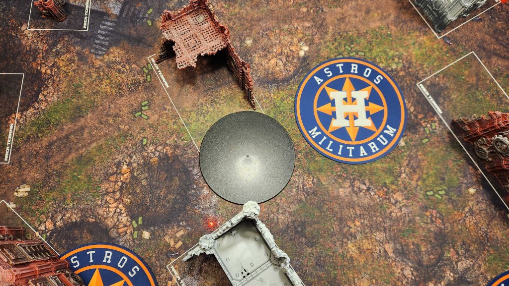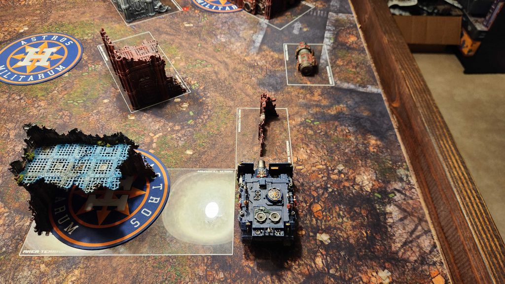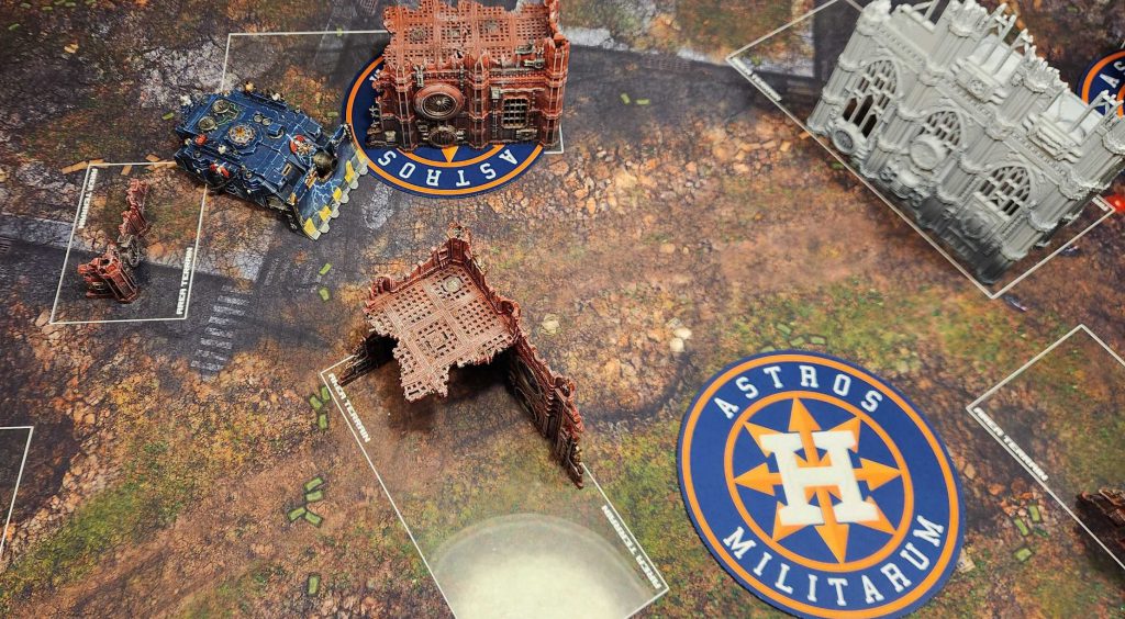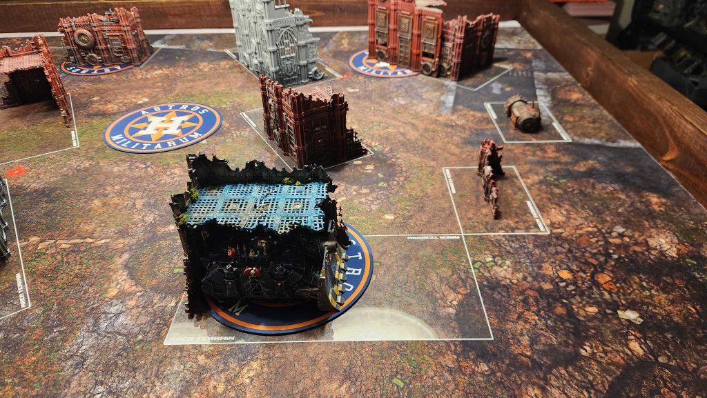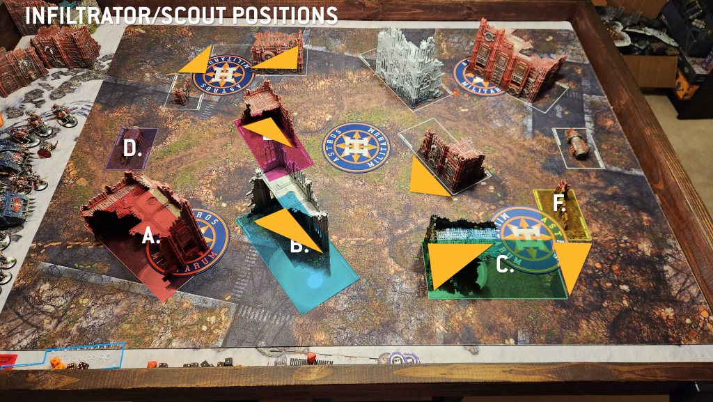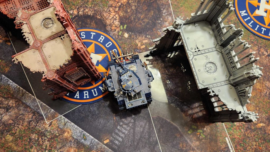 A. Your Home Corner Ruin. This features a U-shaped terrain piece and gives you an easy way to hide while holding the objective, then move out as you need. Infantry units will have an easy time moving from the A to the B ruin here and staying out of line of sight, though wider vehicles may struggle a bit with the gap between the A and B ruins. The width of it in any given game will depend heavily on the terrain being used - in most cases, you'll be able to fit a wider tank like a Rogal Dorn or Plagueburst Crawler through that gap but with some terrain and placement you may find that you can't fit more than a rhino through the gap.