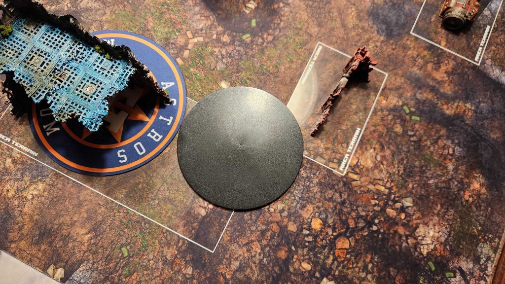 E. The middle ruin. The table's two 10"x5" ruins have been placed in the middle of the table at an angle. These act as both a great shield for line of sight on Crucible deployment and a fantastic staging area for melee units looking to either push into the center of the table or the opponent's B or C ruins - both are options.