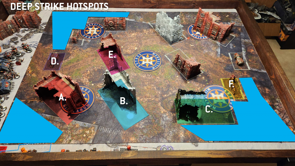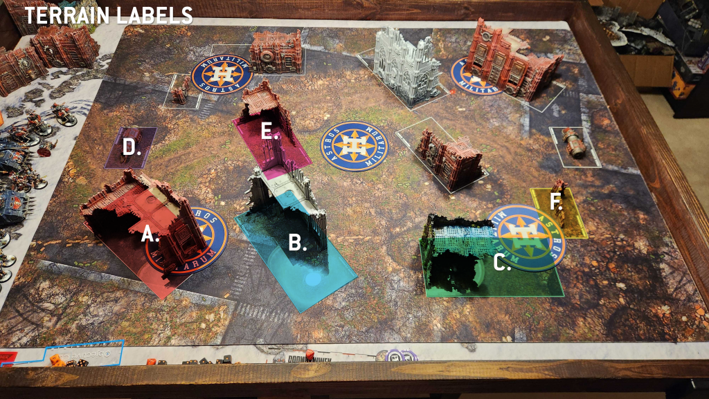 This is a relatively open layout. There are some board-length sightlines down the sides of the table, but those are mitigated a bit by hiding spots along the ruins set 4" away from the long table edges. You do have a few melee staging points and deep strike zones and there are some pretty wide gaps between the terrain features. This is one of the few maps where a Defiler or Soul Grinder on a 160mm base can actually cross the table, using the gap between the E and B ruins (see below for labels), and they can also walk around the bottom of the B ruin.
