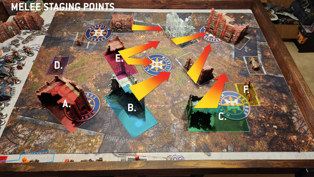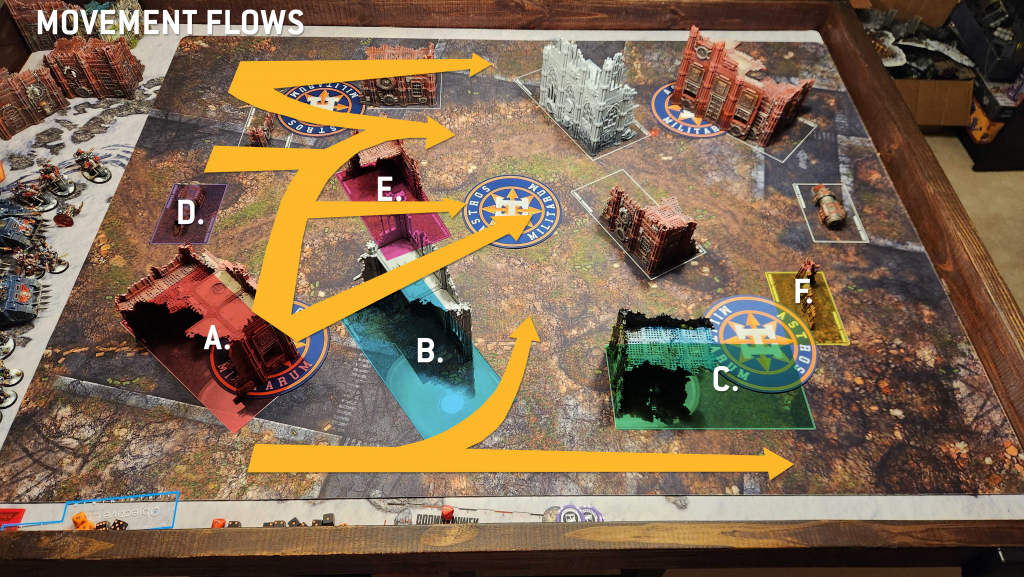 On Search and Destroy you're more likely to see armies move "north," using the cover of the E and B ruins to move up and capture their closer expansion objective with ranged or shooting units, then turning and moving to engage with an opponent. Melee units starting further up can move up on the C ruin relatively safely and so will end up taking that route or rocketing across the middle of the table.