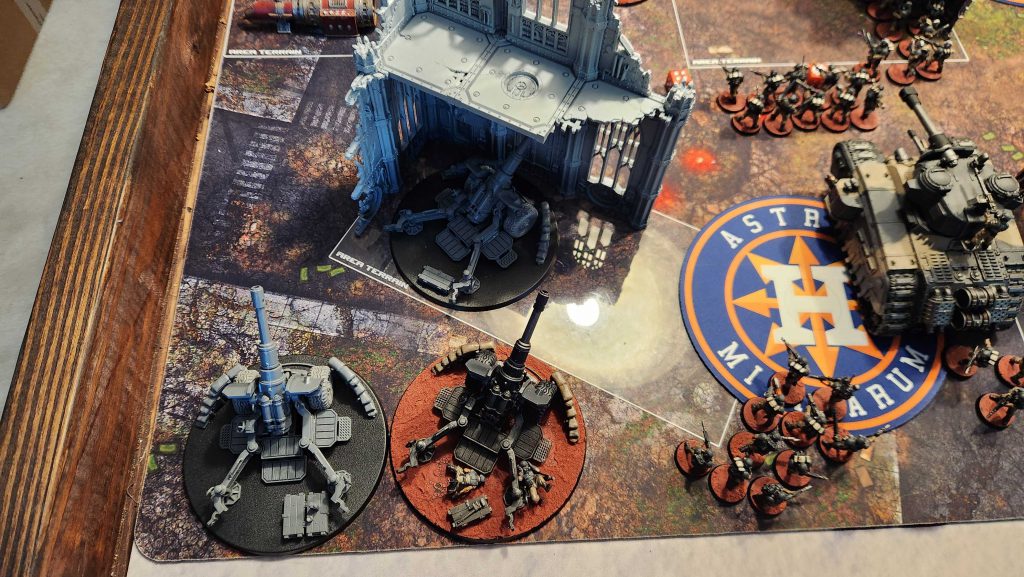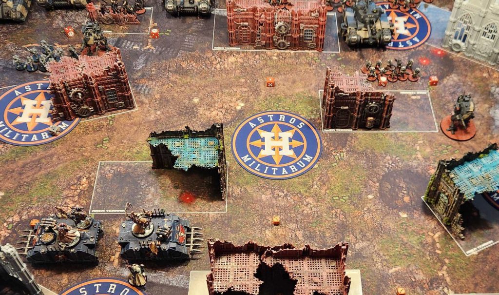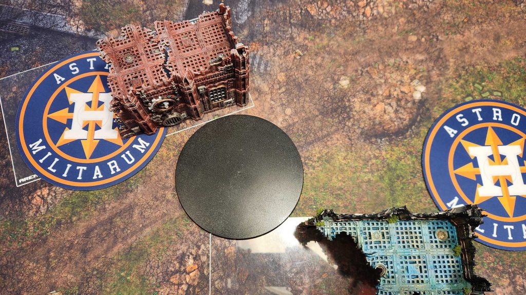 Because this is a pretty open map in the middle of the table, you can easily fit some of those larger vehicles and bases through its ruins. A Defiler can navigate to the middle of the table pretty easily, though hiding in deployment is going to be difficult to impossible.