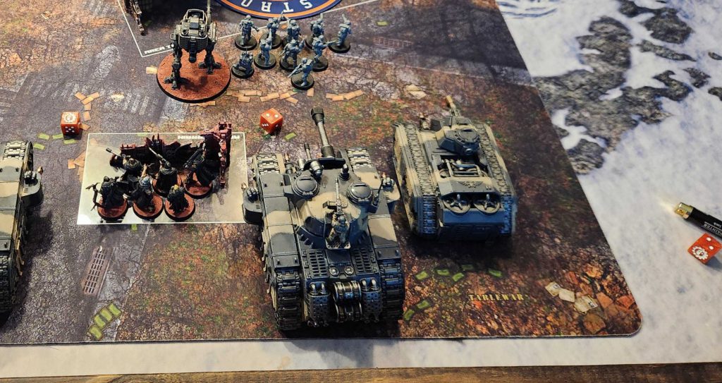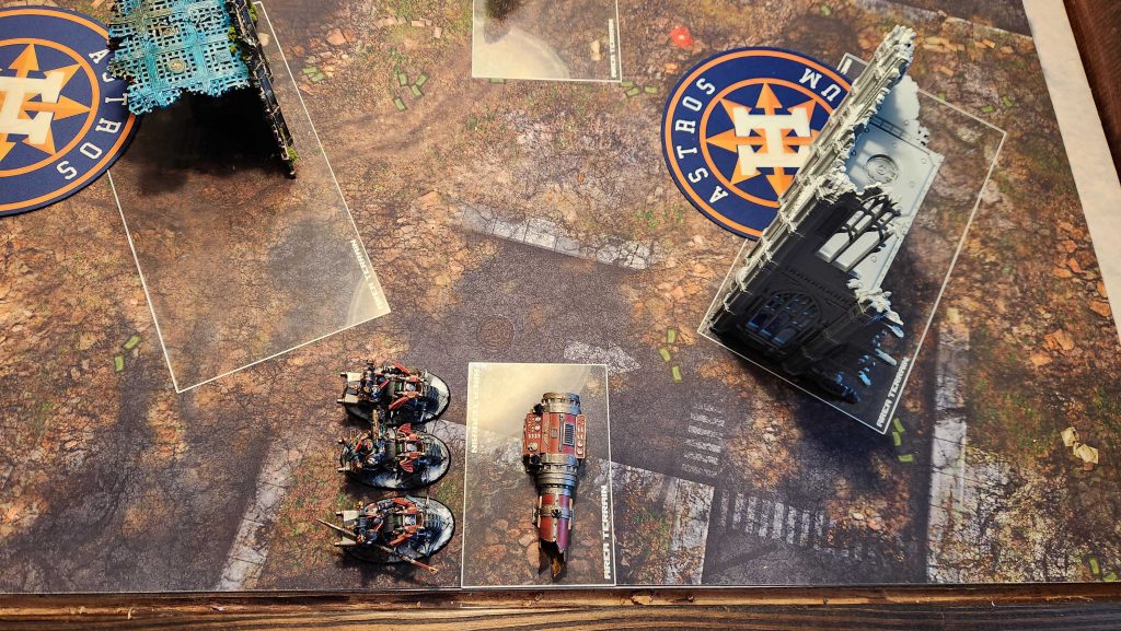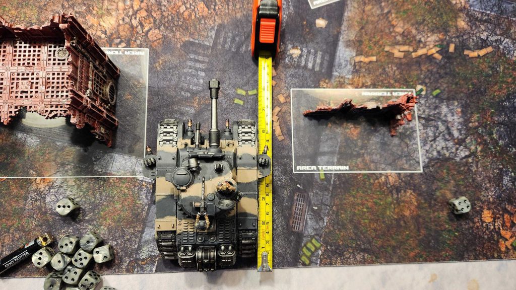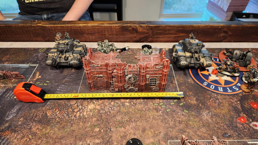 Note that because this ruin is 12" across, you'll need to be careful about how you deploy if you need to hit 12" range for things like auras or issuing orders. In the below example, at least one Dorn needs to be deployed with a sponson over the ruin in order to ensure the Tank Commander can issue orders to the other.