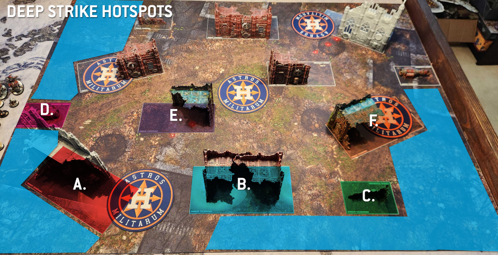 Because this table offers a lot of deployment zone lengthwise, it's typically difficult to screen the entirety of it out. This means that the table has some pretty large deep strike hot spots, typically using the D. ruins for cover or dropping into one of the corners after you've moved out of that area.