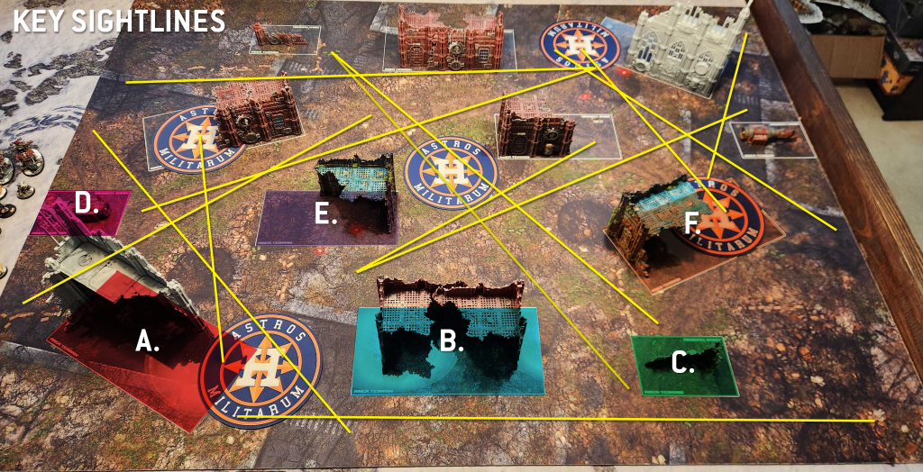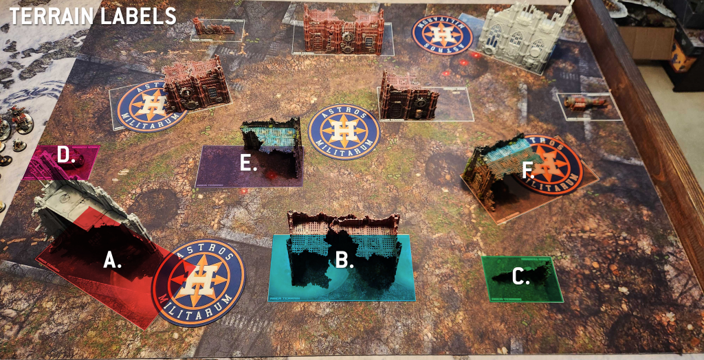 F. Your angled midtable ruin. The other part of your forward protection, this combines with the two small C. and D. ruins to give you a more protected corner moving up the table, which more or less means that you'll be using this avenue to move a large portion of your army toward your opponent's deployment zone... and they'll be doing the same.