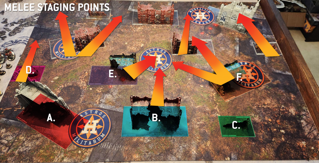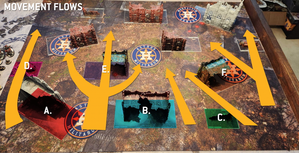 The staging options here are also not great; your center E. and F. ruins are both pretty small and easily visible to shooting units in your opponent's deployment zone. Again here, the D. ruins are crucial to moving up, particularly if you have a faster unit who can sit behind them for a turn without dying. There's not much else to say; the middle is a death trap.