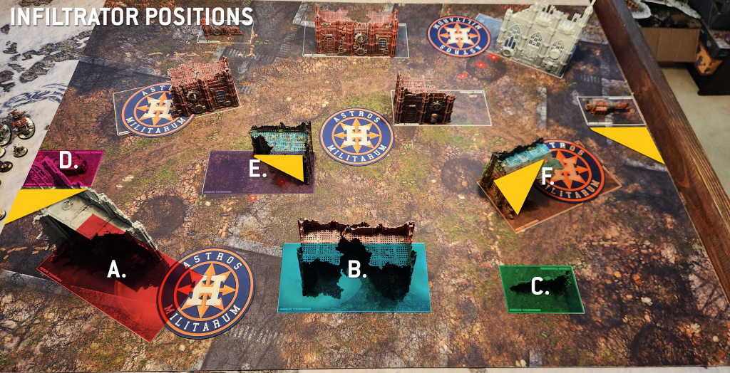 There's almost nowhere good for Infiltrators on this map. A few areas in ruins I might consider, and even those aren't too hard to just get to from your deployment zone with a fast unit or a decent advance roll.