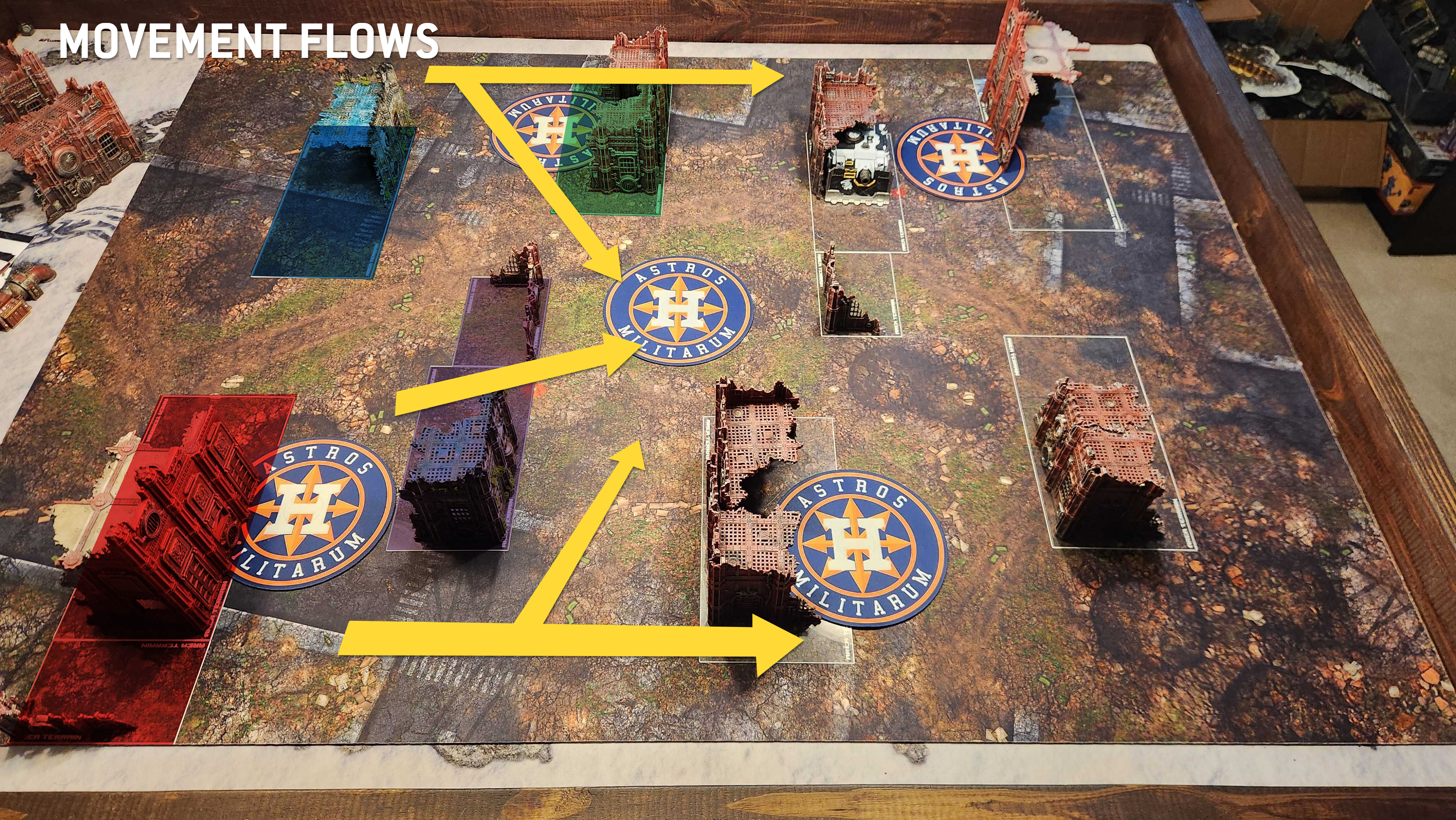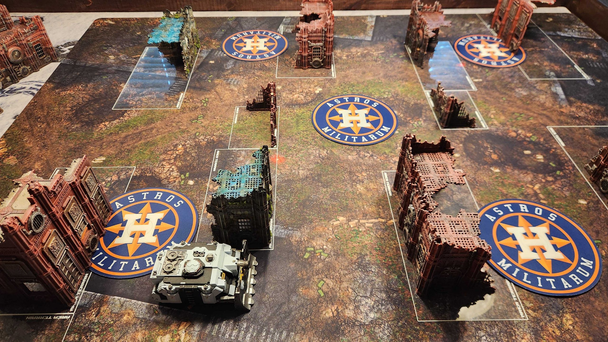 There are some long sightlines on this map. The big ones down the long edges of the table are among the most notable and while they're fairly narrow, it's easy to hide a tank behind the A ruin, drive it across on turn 1, and then see down the entire table. You'll want a 48" gun to do this, but it'll otherwise be difficult to hide in that lane. That said, the D ruin does give you some cover from this lane, but not a ton.