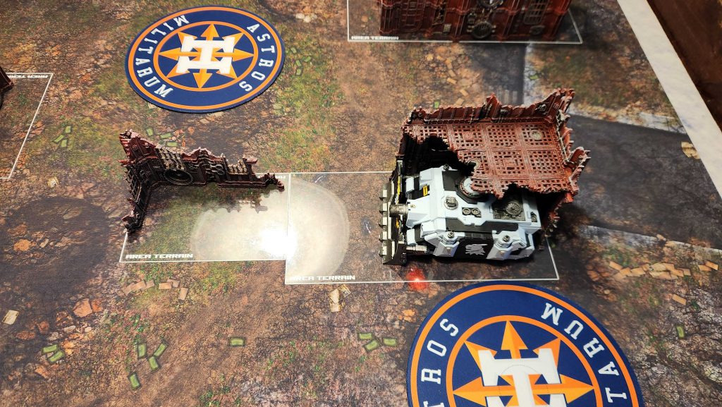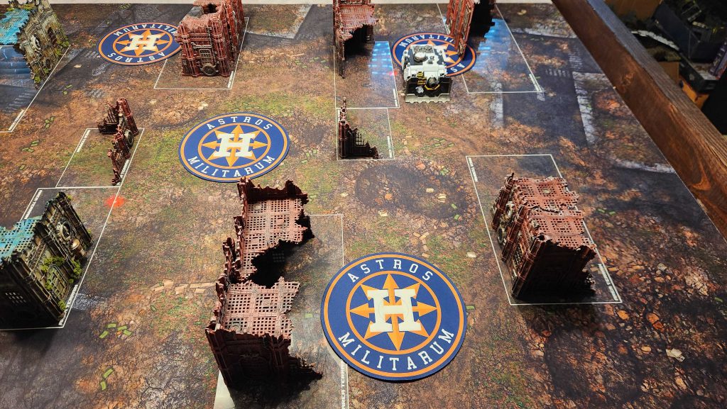 Of note here is the fact that those middle ruins made from 10x5" and 4x6" terrain bases are considered one continuous ruin, and something hiding in that terrain will be able to easily see the objective on the other side of the table unless the walls on that 4x6" feature are sufficiently tall.