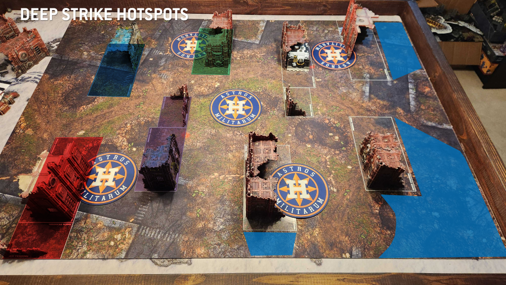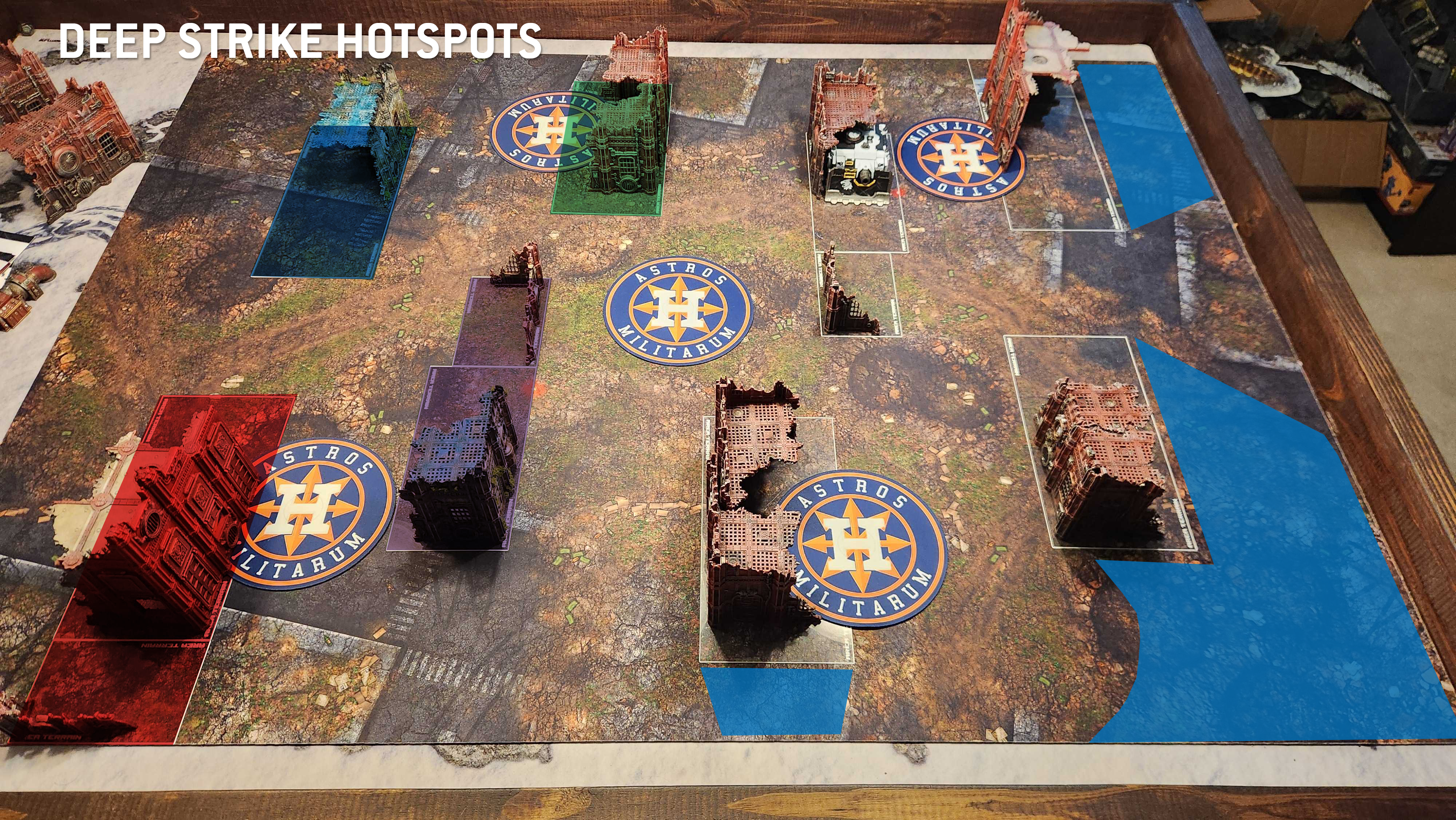 Deep Striking on this map is relatively easy if you're playing Hammer and Anvil, and a nightmare if you're playing Tipping Point. Those vertical ruins can provide absolute cover if your opponent pushes up too far and you can put them between your unit and theirs, but they offer very little hiding room from an opponent who is able to move into his backfield and the long sightlines will leave you a sitting duck if they have good ranged shooting that can reach that column.