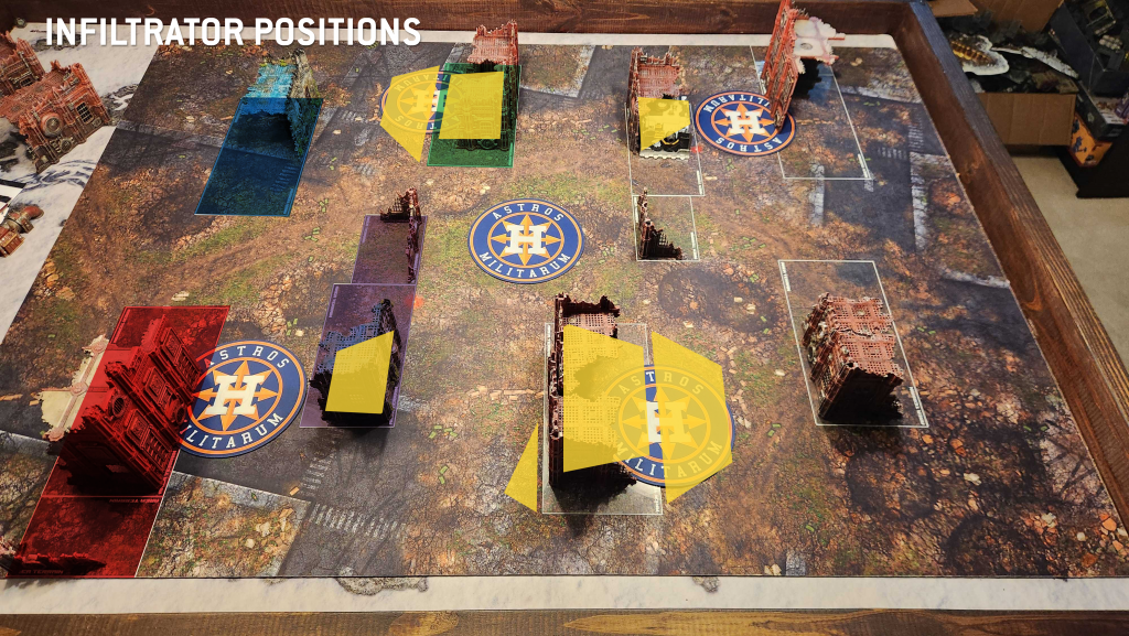 This map doesn't really have any good Infiltrator positions. Your best bet is going to be deploying forward onto objectives on the D. ruin closest to you for an easy early objective grab. On Hammer and Anvil your options are even more dire, though your opponent's D. ruin will give you some protection if you want to stage aggressively for a turn 1 charge through the wall into your opponent's deployment zone.