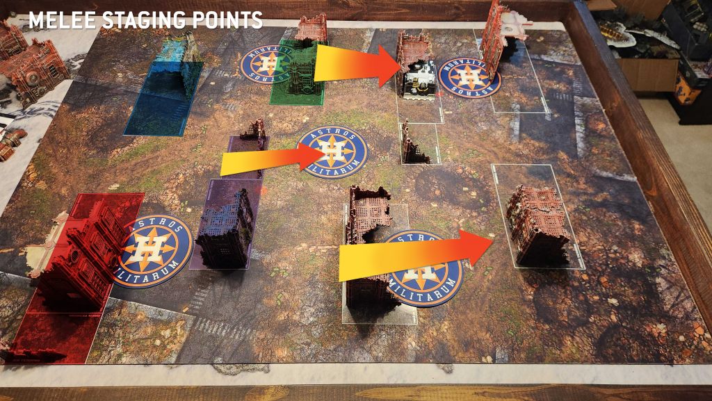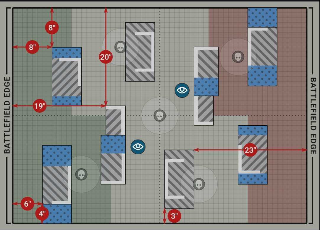 This isn't a hard map to stage on, but the points you can stage from are very predictable. There are essentially three spots you're going to use: Behind the C. ruin, or behind either D. ruin, pushing through those walls toward the next objective. Going from your home D. ruin can be especially dangerous; it's easy to get screened out of that terrain by a unit set 1" back from the wall of the C. ruin, and the gap between those two buildings - the C. and D. ruins - is 8", so even if you can charge something going from ruin to ruin, you'll probably need a 9+ unless both units are pushed right up against their respective walls.