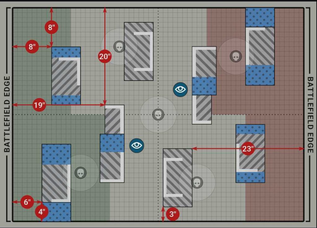 Layout 7 is weird. In almost any situation I'd rather be playing Layout 8, which is one of, if not the best layouts GW have created. in that sense, 7 feels like a worse version of 8, and one with an odd terrain piece in the center of the table. The long sightlines here aren't ideal, and it's one of the game's toughest maps for deep striking and infiltrating units. It'll be better to play on Tipping Point, but I'd still recommend Layout 8 over this one.Have any questions or feedback? Drop us a note in the comments below or email us at contact@goonhammer.com. Want articles like this linked in your inbox every Monday morning? Sign up for our newsletter. And don’t forget that you can support us on Patreon for backer rewards like early video content, Administratum access, an ad-free experience on our website and more