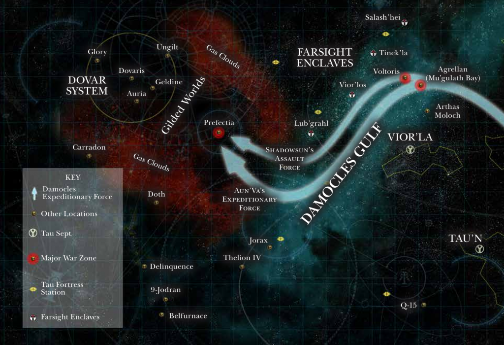 On the T'au side, it was time to figure out next steps, and war councils debated how to proceed. The T'au renamed Prefectia "Vas'talos," which means "boundless scope," a clear signal of the belief that unbrided expansion was around the corner. Many of the Fire Caste believed they should consolidate their gains, but Aun'Va overruled the council, saying that the expeditionary force would divide its strength, one half pushing into the Dovar system as the other half returned to fortify their supply routes to Mu'gulath Bay (formerly Agrellan). On the T'au comms channels word was already spreading of their great success, and of Shadowsun's victory on Prefectia. They reported that the grand monarch of the Space Marines had been slain, a grim-faced figure in black armor. And they reported on the devastating new war machines which had brought that victory, the Ghostkeel and the Stormsurge.