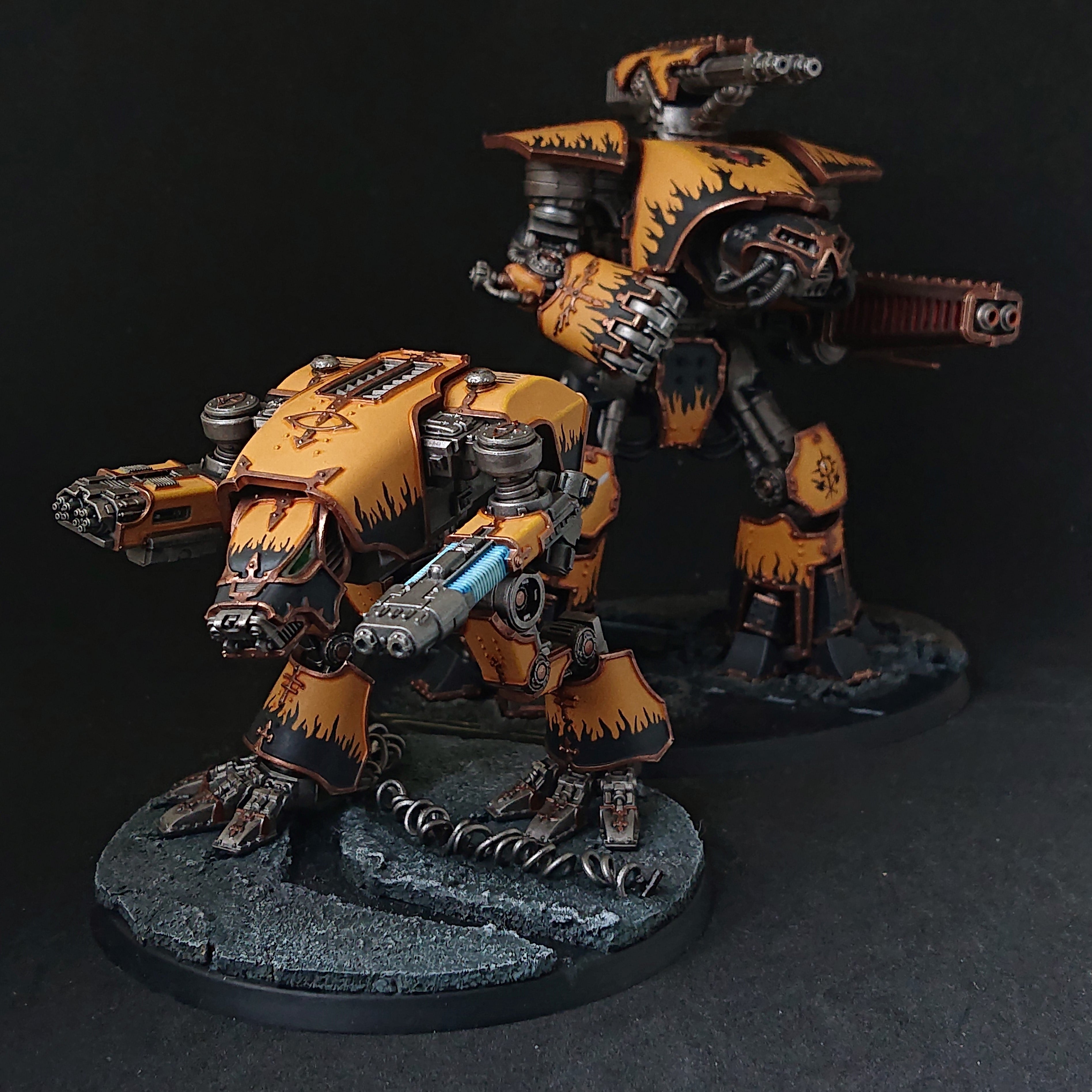 Legio Fureans Warhound and Reaver. Credit: genolaThere are a few other tricks worth talking about here, though. First, Knights on Charge orders have to move in a straight line, a restriction that Titans don’t share. If you position carefully, you can set yourself up to avoid charges from the Knights while potentially having the ability to counter-charge if they overextend. Use blocking terrain to your advantage, but keep in mind that Knights ignore difficult terrain.