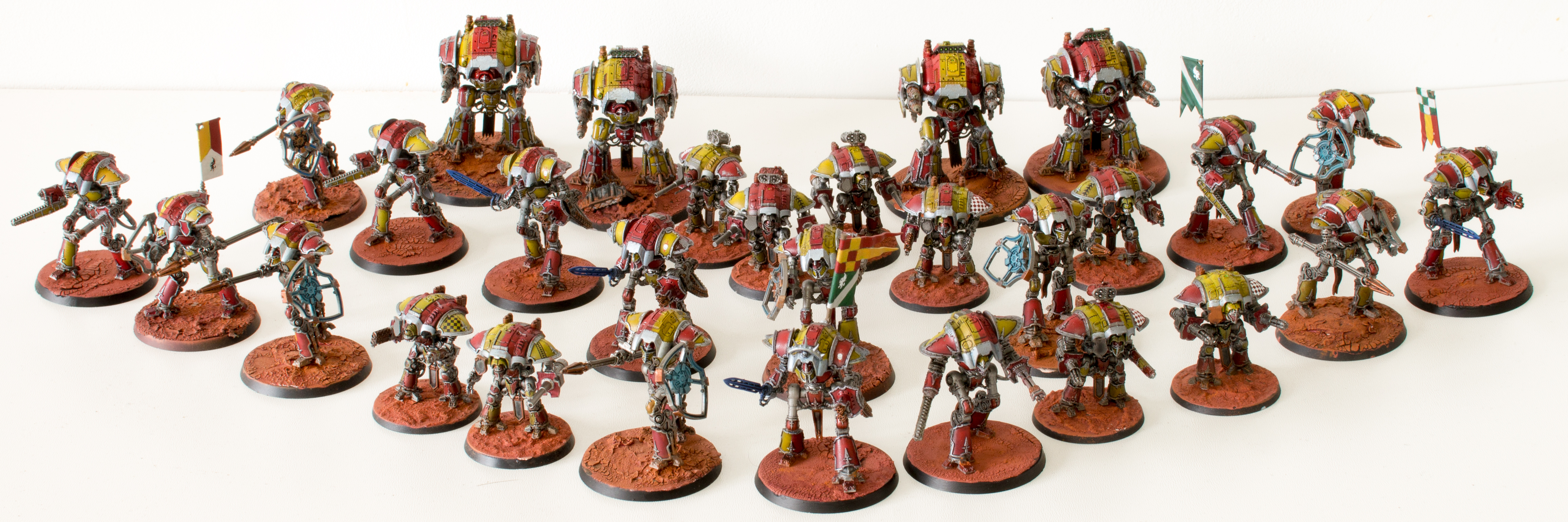 Knight Household of Vornherr. Credit - SoggyOf course, the hits that do get through are going to hurt, especially due to the large number of blast templates CSM’s maniple is throwing around. If you’re playing with any significant amount of terrain, it can be difficult to keep a Knight banner spread out enough to avoid a large blast template while still having them close enough to be able to move all the Knights close enough to attack their chosen target. Take advantage of that, and do what you can to funnel them into killzones you can take advantage of.