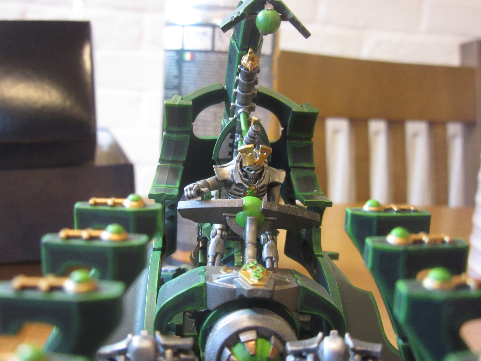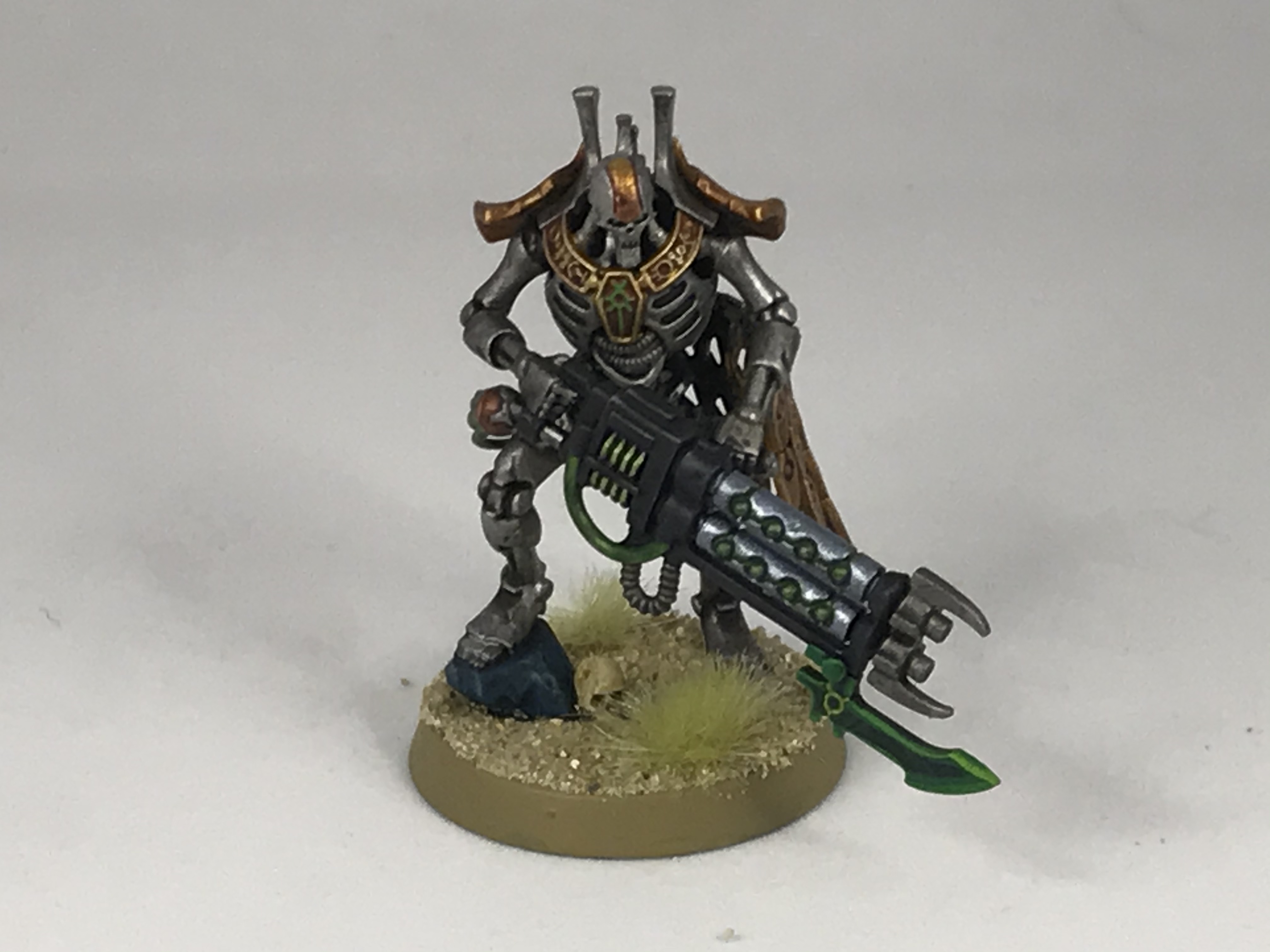The Indomitus Overlord. Credit: Robert "TheChirurgeon" JonesIt isn't just the old we're looking at though - the HQ slot is one of the places where we get some new friends. First up, for a 5pt premium over a regular Overlord you can use the fancy new Overlord datasheet. This trades their melee weapon for a slightly worse version but gains a Tachyon Arrow and, importantly, a substantially improved version of their buff effect. Rather than only the unit selected for My Will Be Done getting a movement buff, now any unit starting within 6" of the Overlord gets +1" to their move thanks to the Relentless March aura, with MWBD now just providing the hit buff. That's also improved, having increased range and being able to target any dynasty unit, not just INFANTRY. It seems very likely that tesla will change to go off on unmodified 6s when the Necron book updates, but until then using this on a blob of 9 Tomb Blades is real mean. Between that and just increasing the army's mobility in general, this new sheet seems powerful.