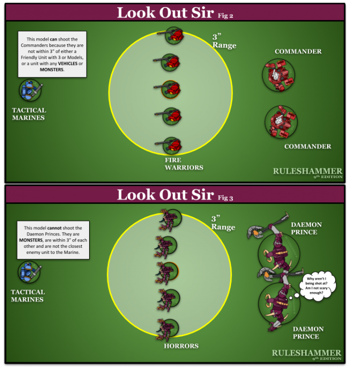 - VEHICLE/MONSTER units with fewer than three models only provide Look Out Sir protection if they have a wound characteristic of 10+