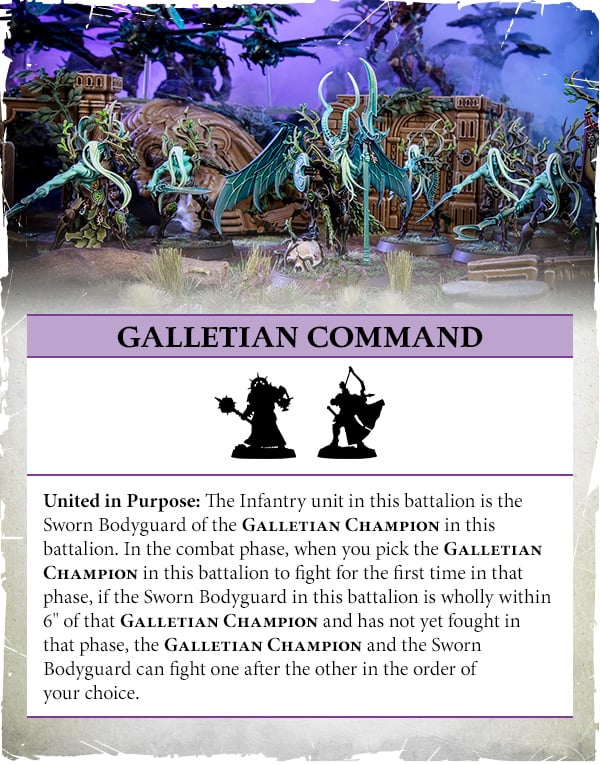 Similar to last season, units that fulfill a certain set of criteria will gain a new keyword that influences many of the rules going forward. In this case, any hero that has less than 10 wounds, does not have a mount and is not unique gains the Galletian Champion keyword. An exception was written into a day 1 FAQ that companions do not count as mounts for purposes of this rule, so don't panic Deepkin players!Probably the most ubiquitous benefit from this is The Key to Victory rule, which makes it so Galletian Champions cannot be targeted by ranged attacks if they are within 1" of a battleline unit. This basically gives Age of Sigmar the Look Out, Sir! rule from 40k. A massive benefit against the extremely powerful ranged shooting from armies like Lumineth and Daughters of Khaine, be aware it won't protect you from spells and other abilities that hit your Heroes from range, so don't get too reckless. As always there's also a core battalion to counter this rule, but we'll get to that.