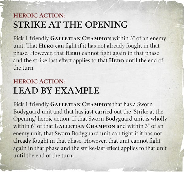 Credit: Warhammer CommunityThe other half is Desperate Actions which only applies to the player going second for the round. One Galletian Champion gets two Heroic Actions instead of one (but only in your hero phase) which is a huge windfall for whoever is going second. Can't decide between Heroic Recovery and a Command point? Why not both? It also pairs well with this season's Heroic actions, which we'll detail next.