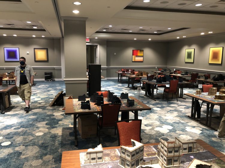 For me and the US GHO, this was a week ago, when I was roasting in the sun and trying to pound out the last of the Military Base terrain kits. In addition to playing in the GT, I had a lot of logistical support for the event on my plate, with the tables in different places and states of construction. My job, the only value I was adding to the entire event, was making sure that come hell or high water (ironically, the remains of hurricane Ida did cause some light flooding last week near where we had the terrain stored) all of my precious MDF children made it to Rockville in one piece. After everyone finished setting up on Friday, I looked around the room and saw what looked for all the world like an actual GT, which it was, being run by actual professionals, which we aren’t.