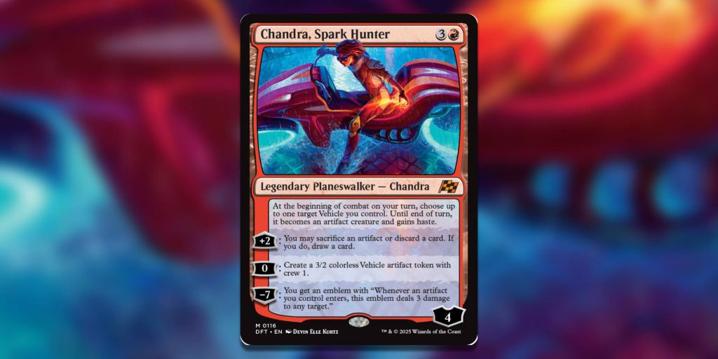 This four-mana Chandra is all about vehicles and artifacts, letting you basically crew a vehicle for free at the start of combat on each of your turns. She also comes loaded with three unique abilities: