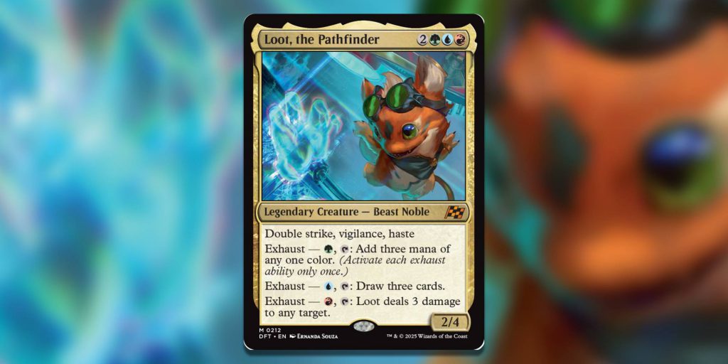 Exhaust is a new keyword ability in Aetherdrift and can be found on Loot, the Pathfinder and some other cards. The adorable little fella has three exhaust abilities: An effective Black Lotus, Ancestral Recall, and Lighting Bolt. Exhaust abilities can only be used once, but you can reset them with a blink ability or by bouncing and recasting them.