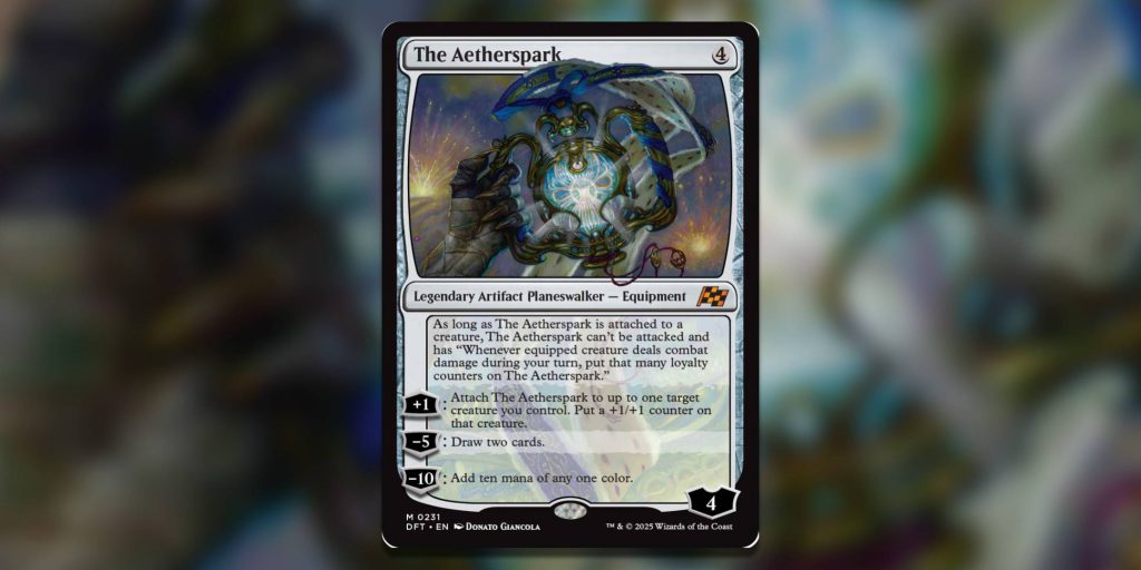 Each of the teams is racing for the grand prize of the Aetherspark, a planeswalker spark contained in a chalice. This prize is made real in an equipment card that has some fascinating abilities. For four mana you get this artifact planeswalker that will function like any other planeswalker. Once attached to a creature, The Aetherspark cannot be attacked anymore, and gains bonus loyalty counters when the equipped creatures deals combat damage on your turn.