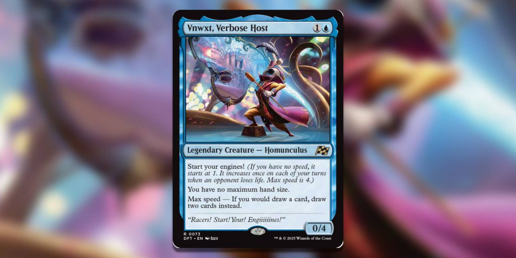 Cards that have Start Your Engine will get you started on the track if you have no speed already, starting you off at one. You can increase your speed by one at the end of your turn so long as your opponent has lost life during your turn. Cards like Vnwxt, Verbose Host that have the Start Your Engine ability get your speed counters going, and then once you hit Max Speed of 4 speed counters, they do something different. In Vnwxt’s case, if you were to draw a card, you draw two instead.