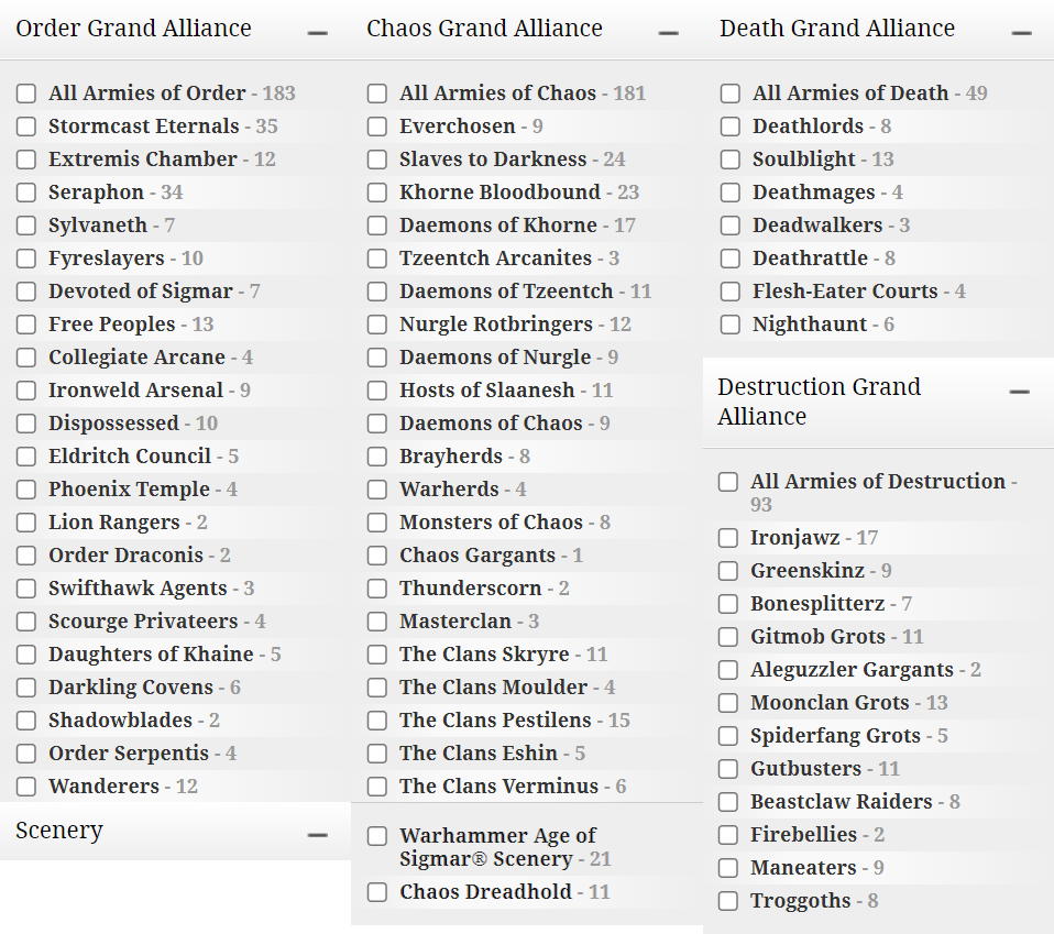Beginning in Grand Alliance: Chaos, there was a splintering of the existing factions into more trademark-friendly nomenclature, although it quickly gave Age of Sigmar the record for the greatest number of legal factions of any Warhammer property, once each of these books came out. Following GA: Chaos, factions like the Beastmen took on different names, from Brayherd, to Warherd, to Thunderscorn, with each crucially being advertised and treated like their own army. This meant Chaos went from 9 factions to 21 while gaining not a single model.In some ways, this allowed hyper-thematic army construction to emerge, and for a few select armies, this idea of spinning off every subset of a faction led to fantastically flavorful forces which persist today, the poster child of which is Flesh-Eater Courts. As another note, this was the end of the 'comedic' rules associated with the launch period of Age of Sigmar, as every GA made sure to prune these rules and give the game a more serious tone, as an effort to be rule-forward. This contrasted the prior sentiment of Games Workshops' board, and represented a change of leadership for the brand as a whole.