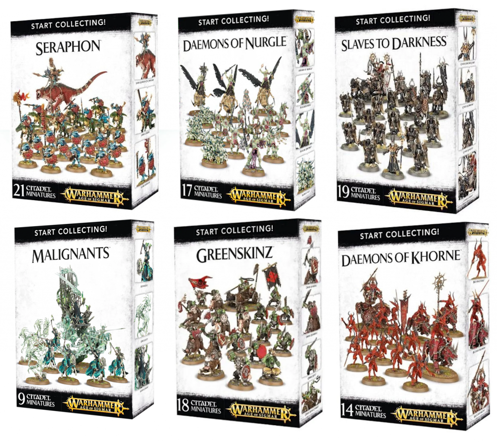 The first 6 Start Collecting! releases for Age of Sigmar.While January as a whole would be extremely eventful for Age of Sigmar, being the release of another non-launch faction later on, January 2nd marked the beginning of a new trend towards accessibility for the company as a whole: Start Collecting!. These boxes launched at a cool $85.00 in 2015 (About ~$110.00 today) and made an immediate splash as the best bundles provided to armies not featured as a launch faction for a game's new edition. Each of these came packaged with a centerpiece model, hero, and usually 1-2 troop options, but crucially they were often just a hair more expensive than some of the models contained within. The Seraphon Start Collecting! is perhaps the best-known example, with the Oldblood on Carnosaur kit retailing for the roughly same price as the combined box, meaning every other unit inside was free, or nearly so.